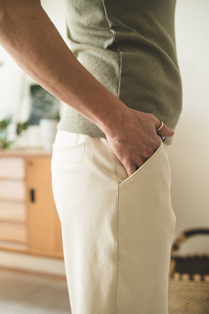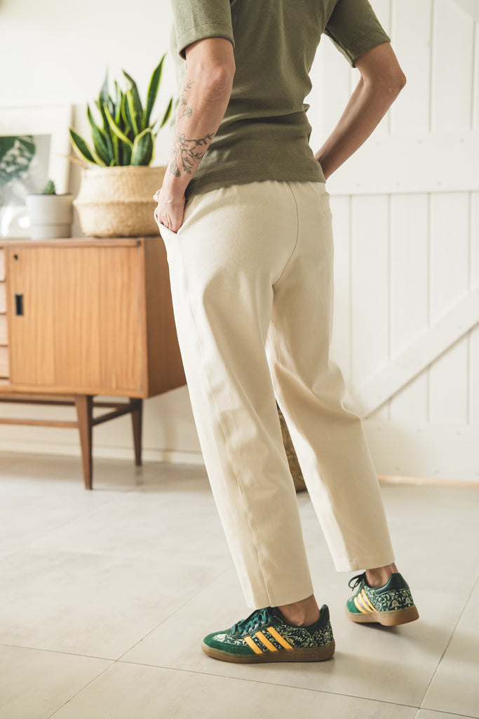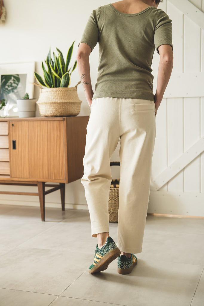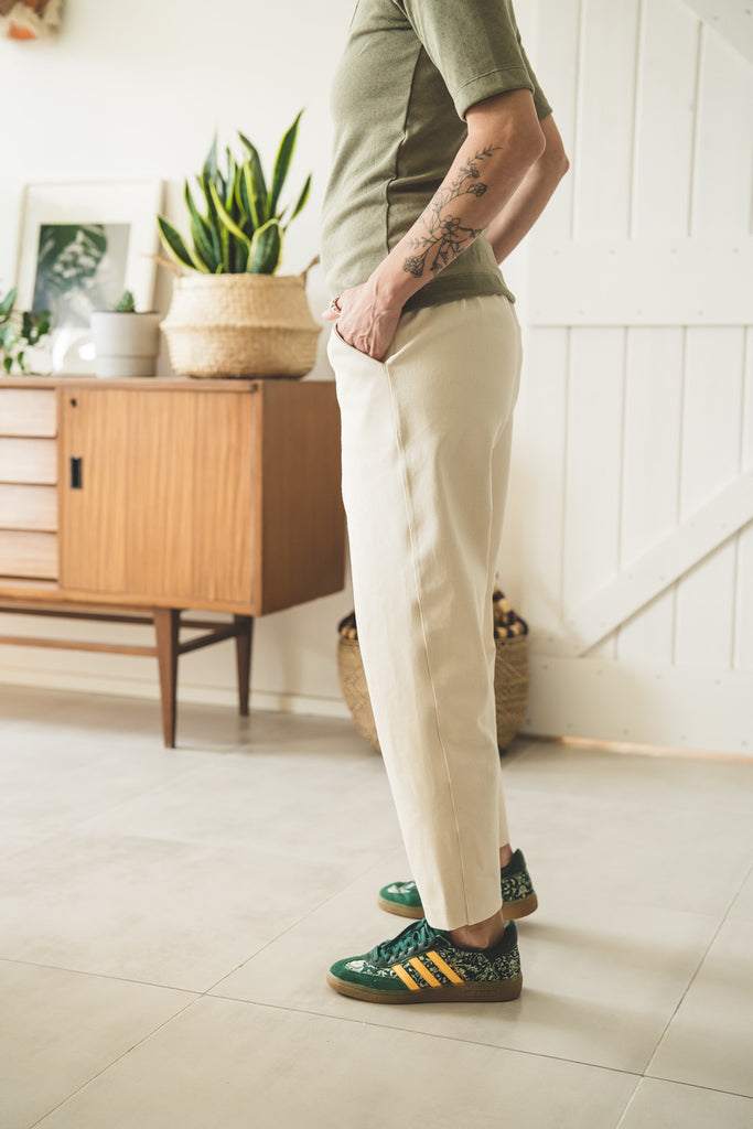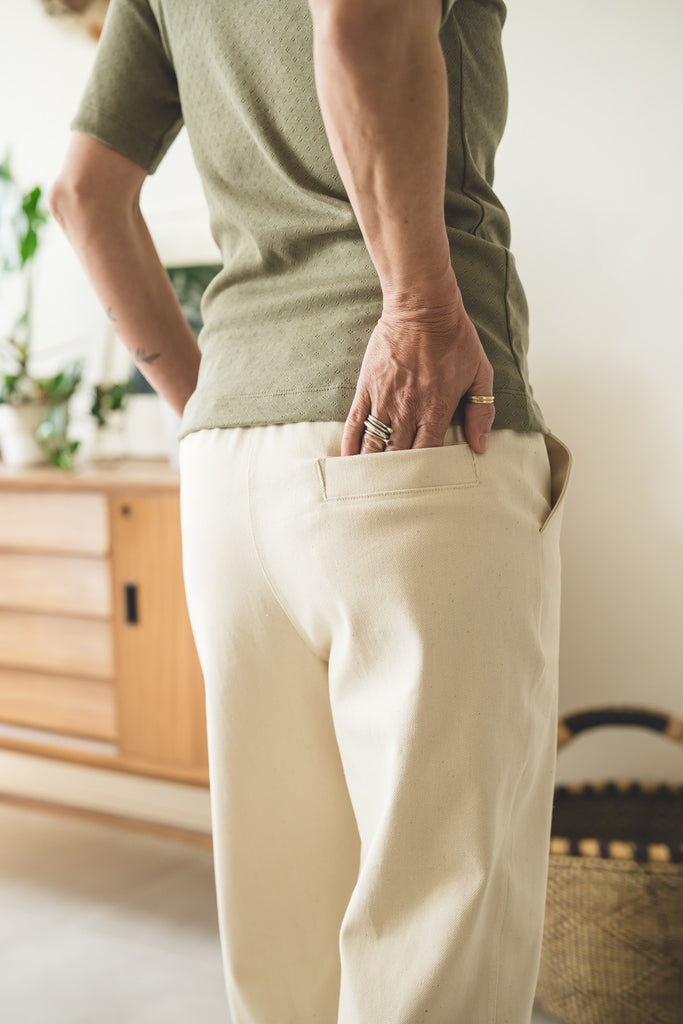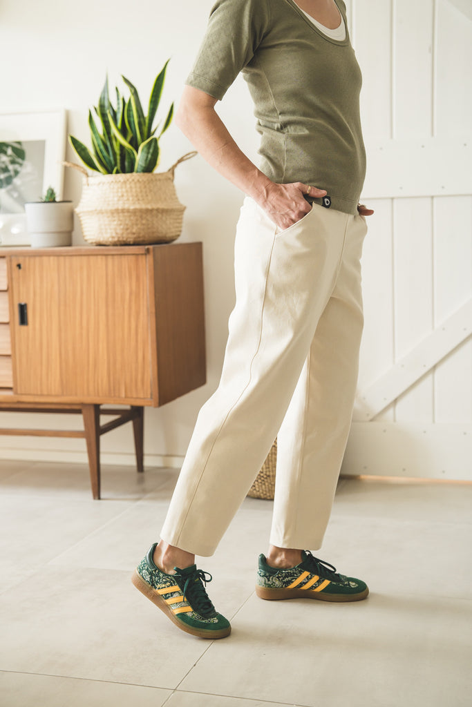 Il nostro YogaPants è il capo più classico tra quelli proposti in questa Special Edition. Modello a sigaretta con due tasche laterali e una tasca a filetto sul sedere. In vita ha un comodo elastico. Ovviamente anche il tuo YogaPants avrà le cuciture ripassate con la macchina da copertura a 4 fili.