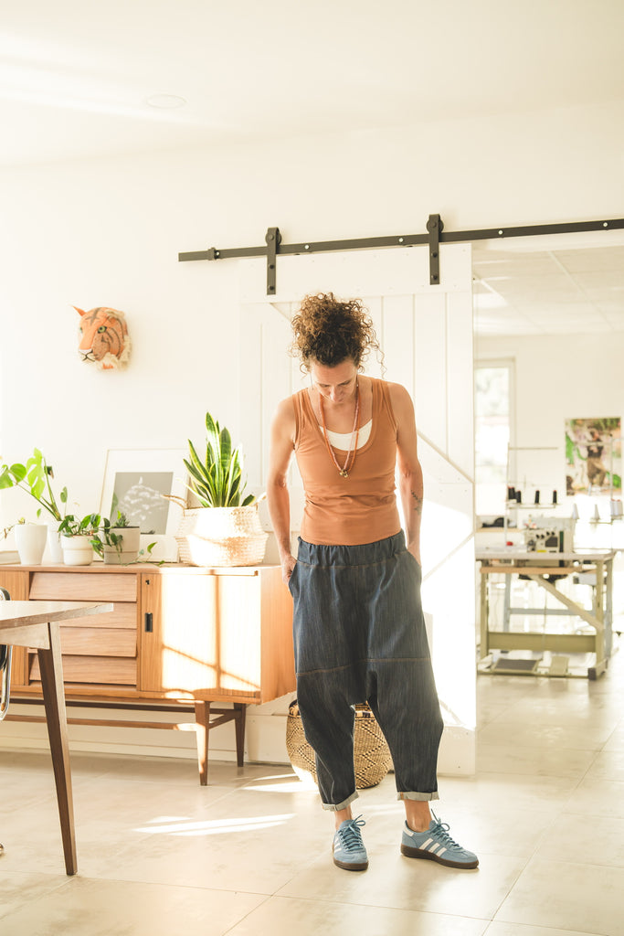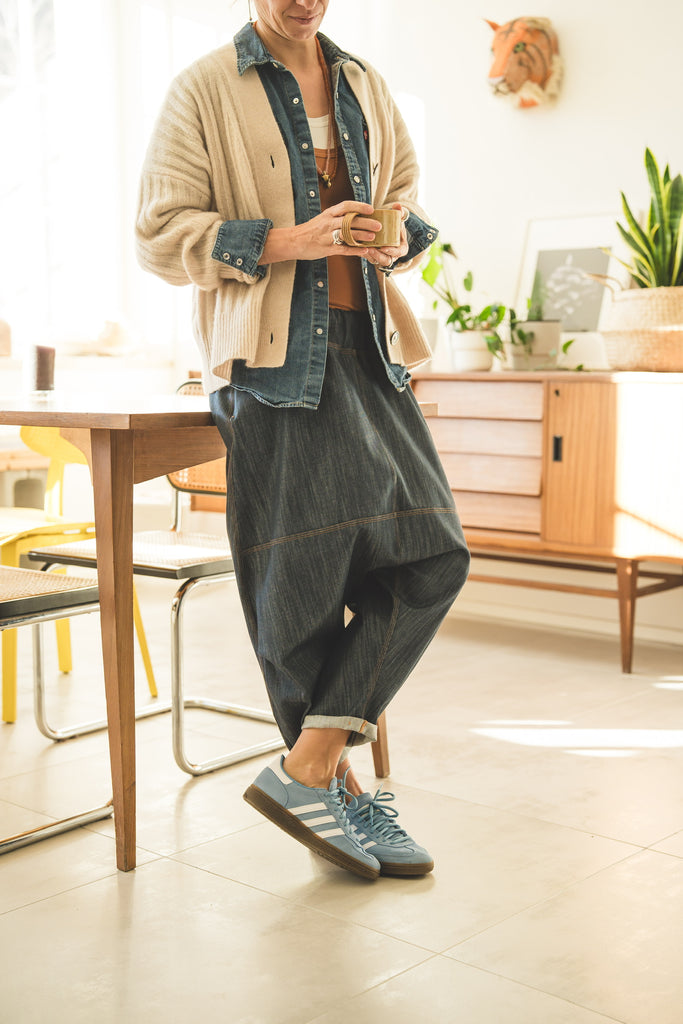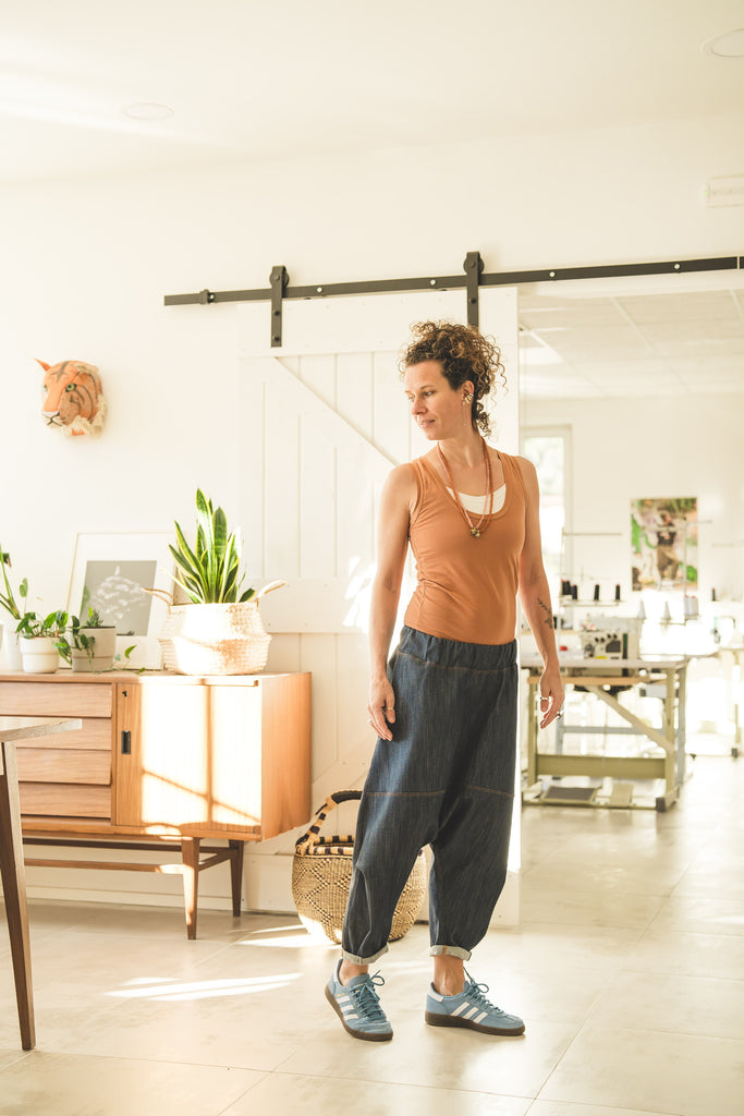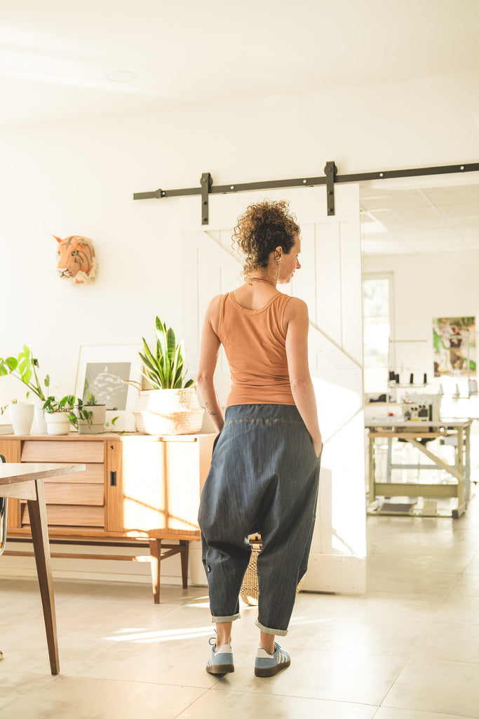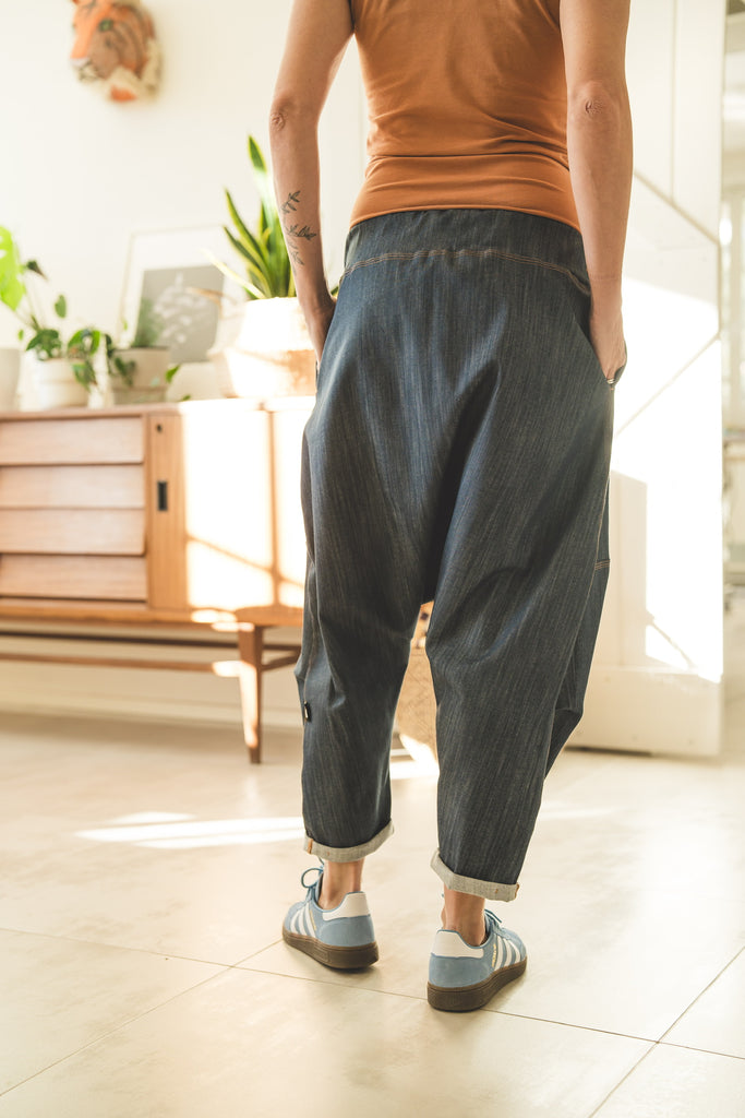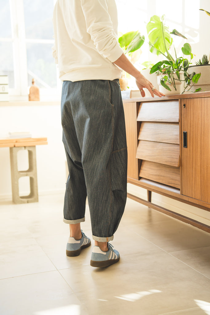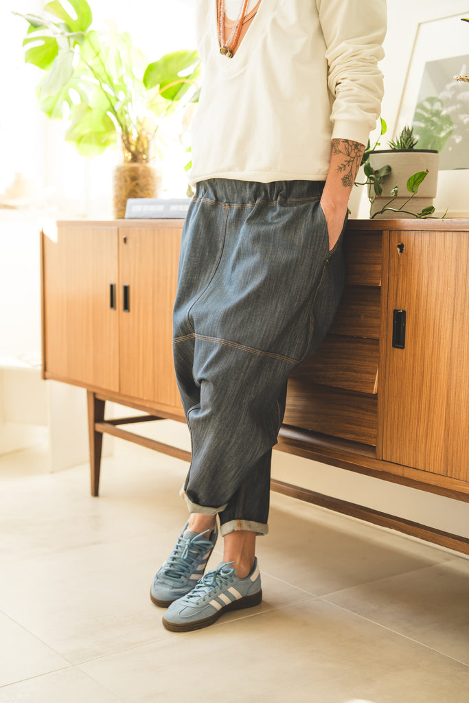 Il nostro modello KoiPants ha il cavallo basso, un comodo elastico in vita, due tasche laterali. La versione in denim ha la cucitura orrizontale e verticale davanti che rende il modello ancora più particolare e stiloso. Dietro è lisco, senza cuciture  e ti avvolge morbidamente. Le pieghe sul ginocchio sono il suo marchio di riconoscimento ;) Anche questo capo ha tutte le cuciture ripassate con la macchina da copertura che lo rende praticamente indistruttibile.