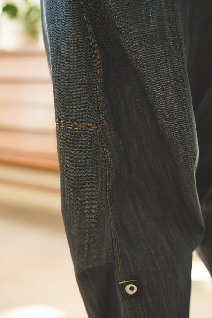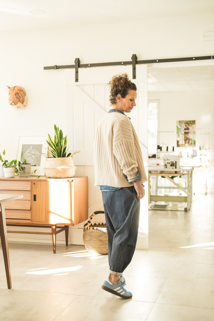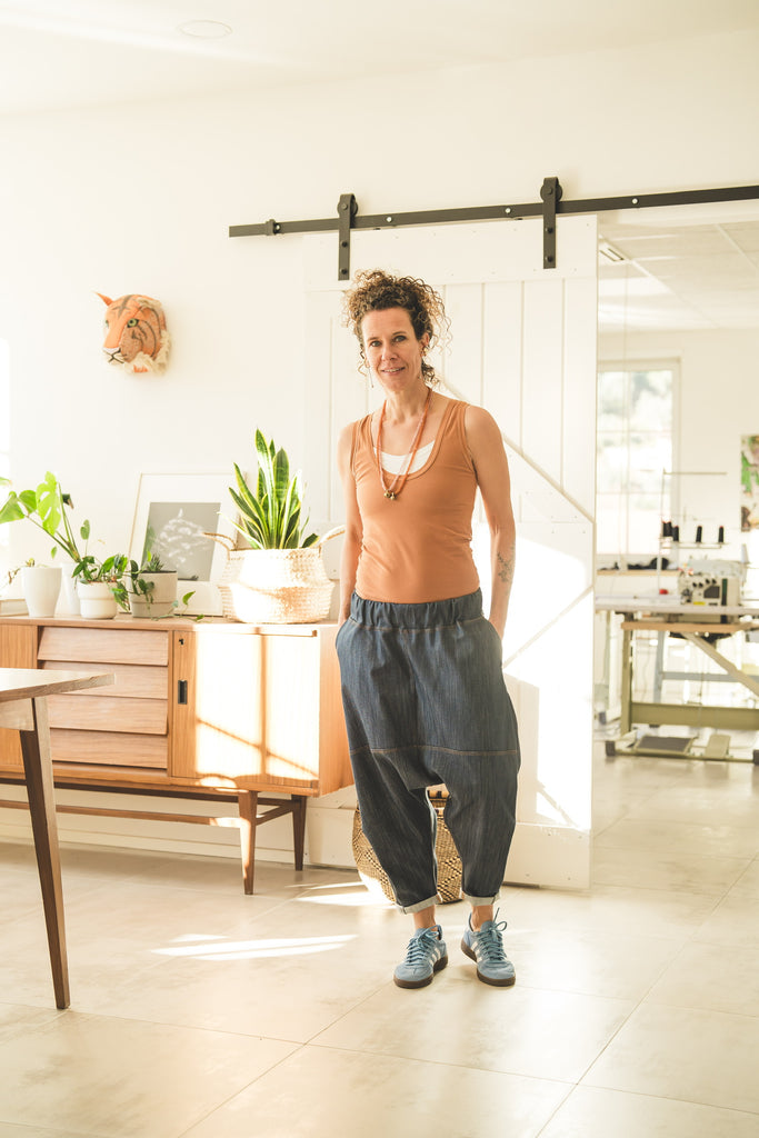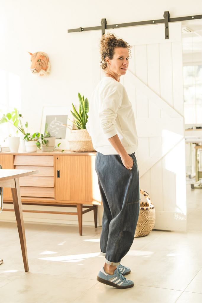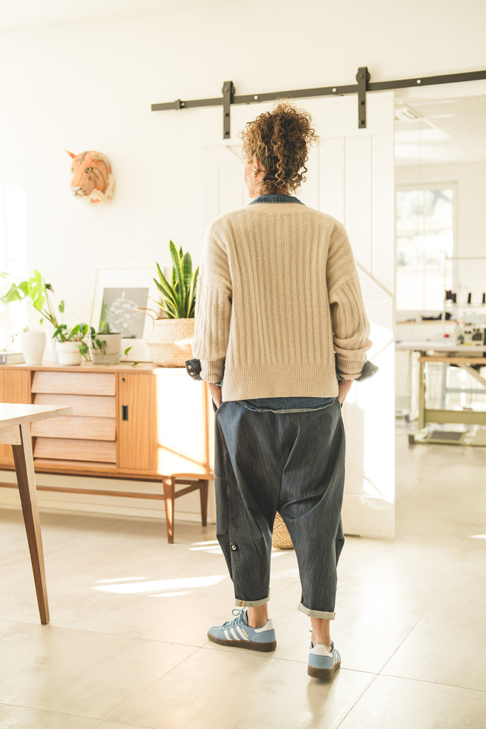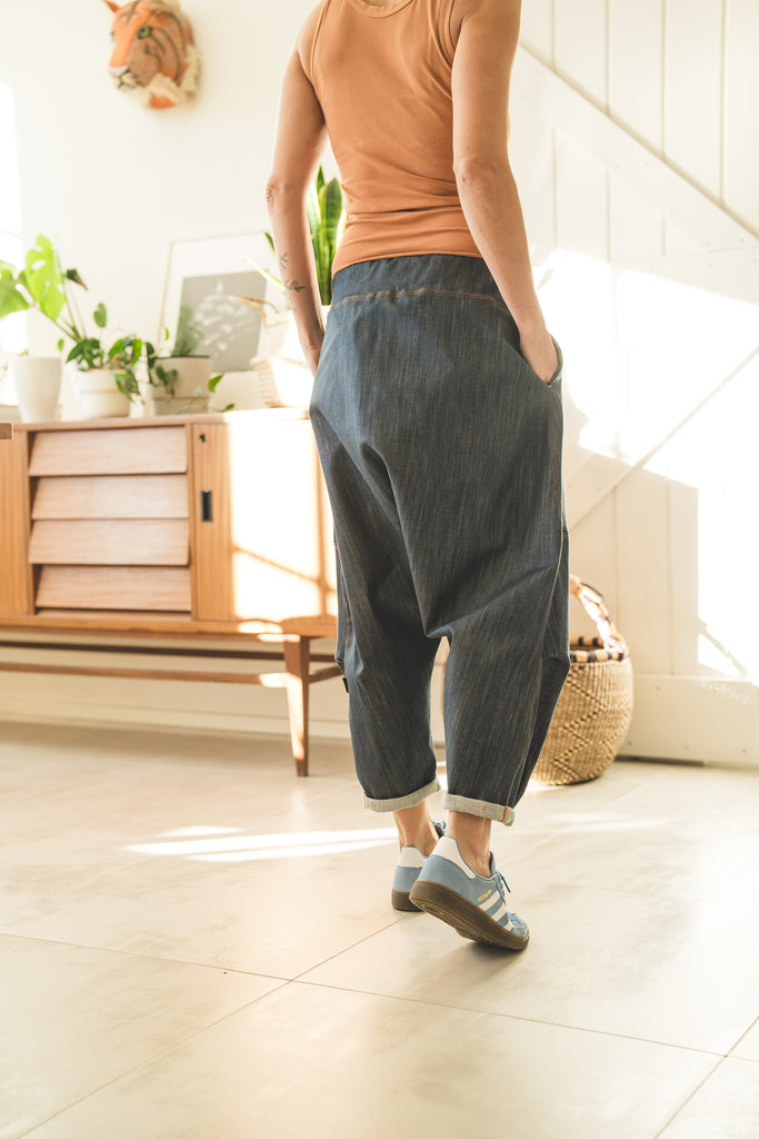 Il nostro modello KoiPants ha il cavallo basso, un comodo elastico in vita, due tasche laterali. La versione in denim ha la cucitura orrizontale e verticale davanti che rende il modello ancora più particolare e stiloso. Dietro è lisco, senza cuciture  e ti avvolge morbidamente. Le pieghe sul ginocchio sono il suo marchio di riconoscimento ;) Anche questo capo ha tutte le cuciture ripassate con la macchina da copertura che lo rende praticamente indistruttibile.