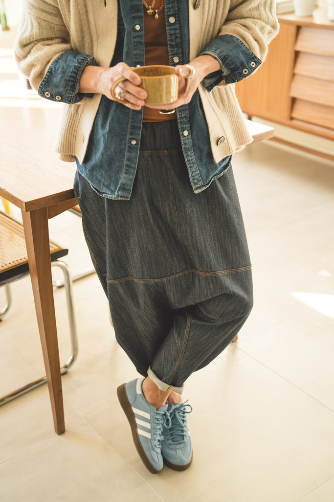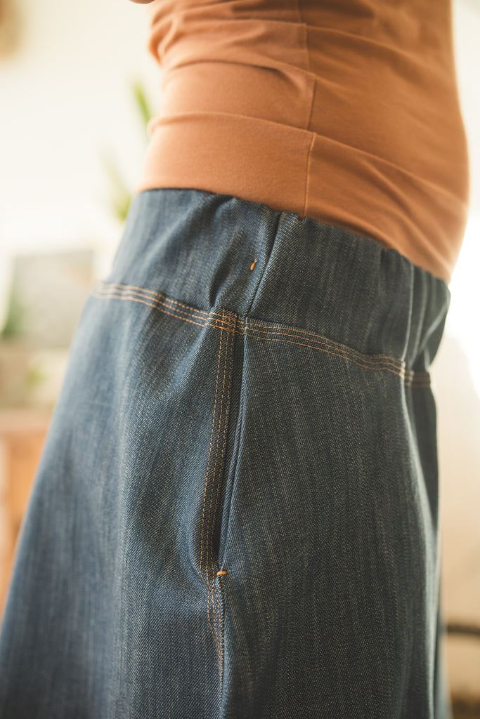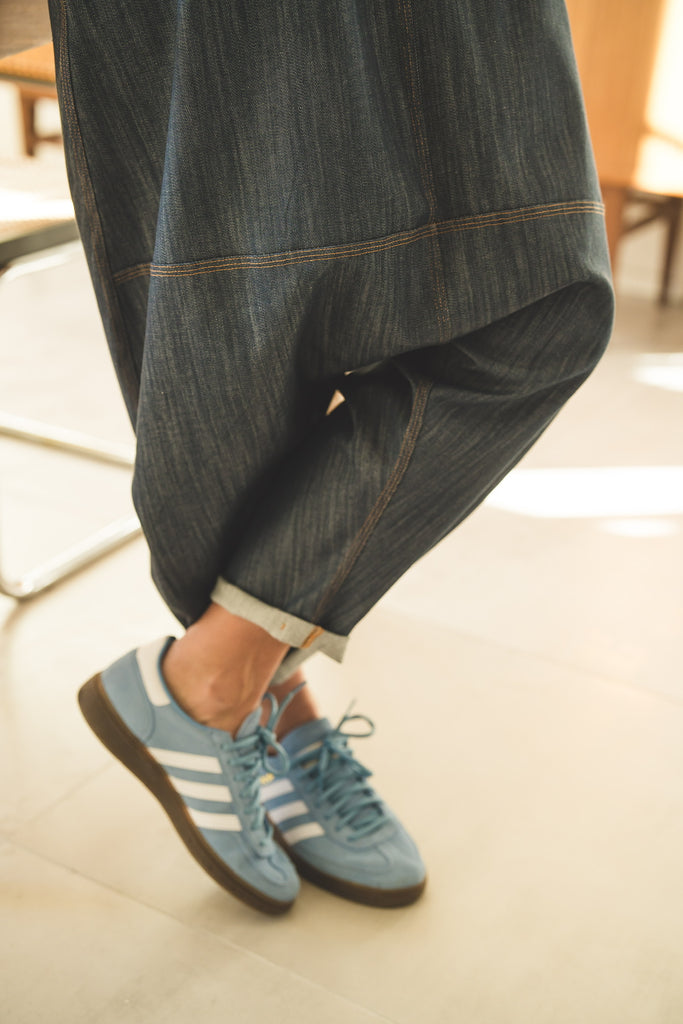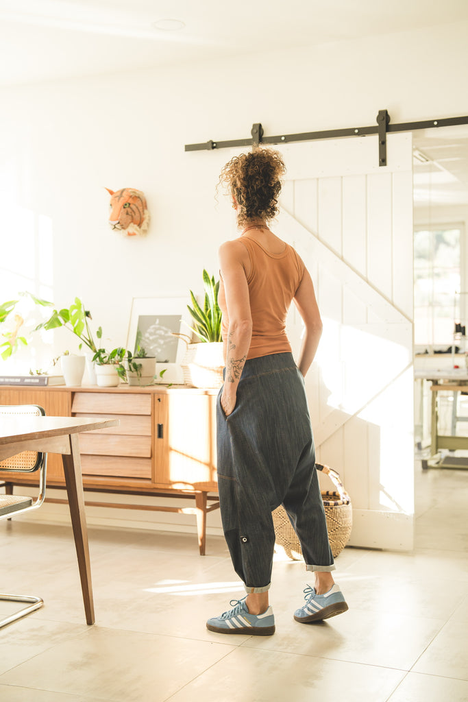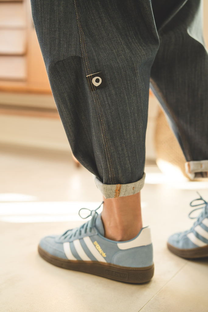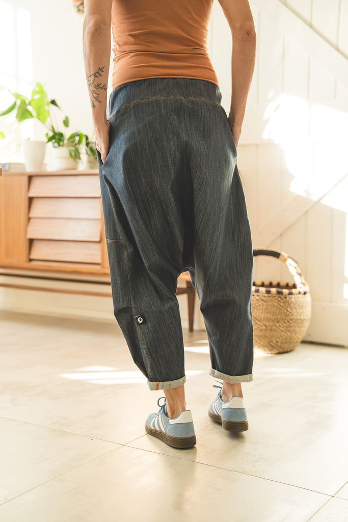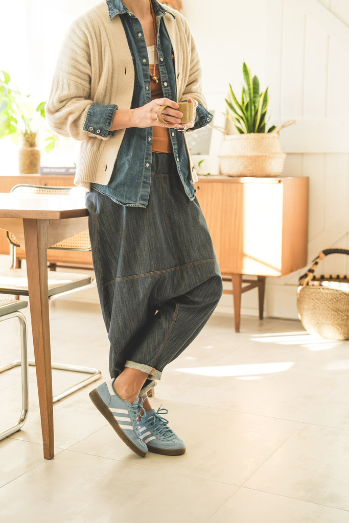 Il nostro modello KoiPants ha il cavallo basso, un comodo elastico in vita, due tasche laterali. La versione in denim ha la cucitura orrizontale e verticale davanti che rende il modello ancora più particolare e stiloso. Dietro è lisco, senza cuciture  e ti avvolge morbidamente. Le pieghe sul ginocchio sono il suo marchio di riconoscimento ;) Anche questo capo ha tutte le cuciture ripassate con la macchina da copertura che lo rende praticamente indistruttibile.