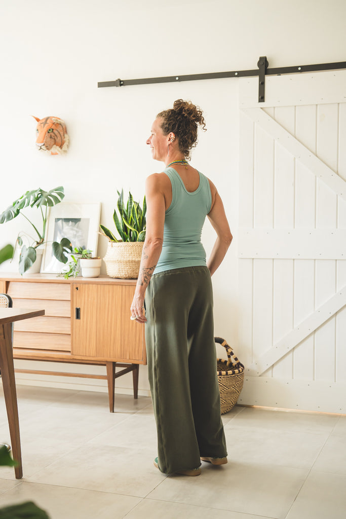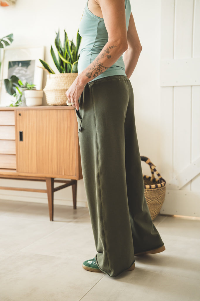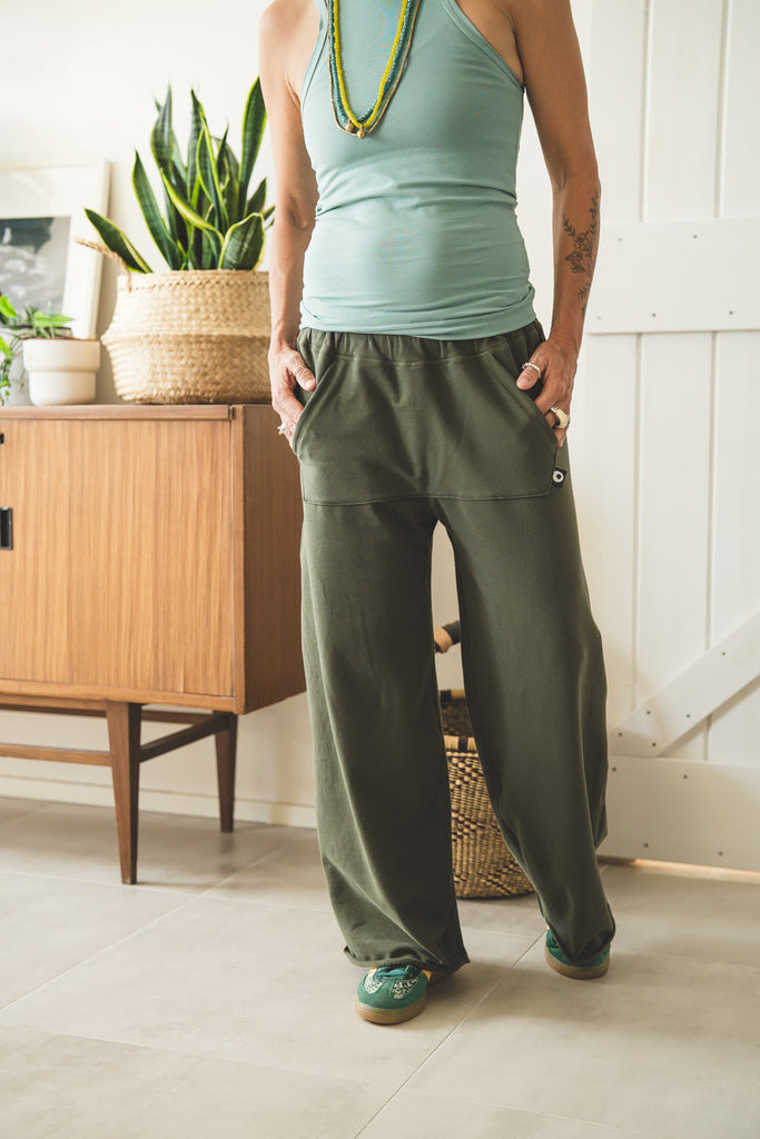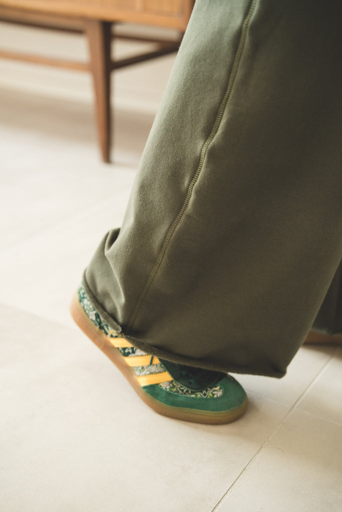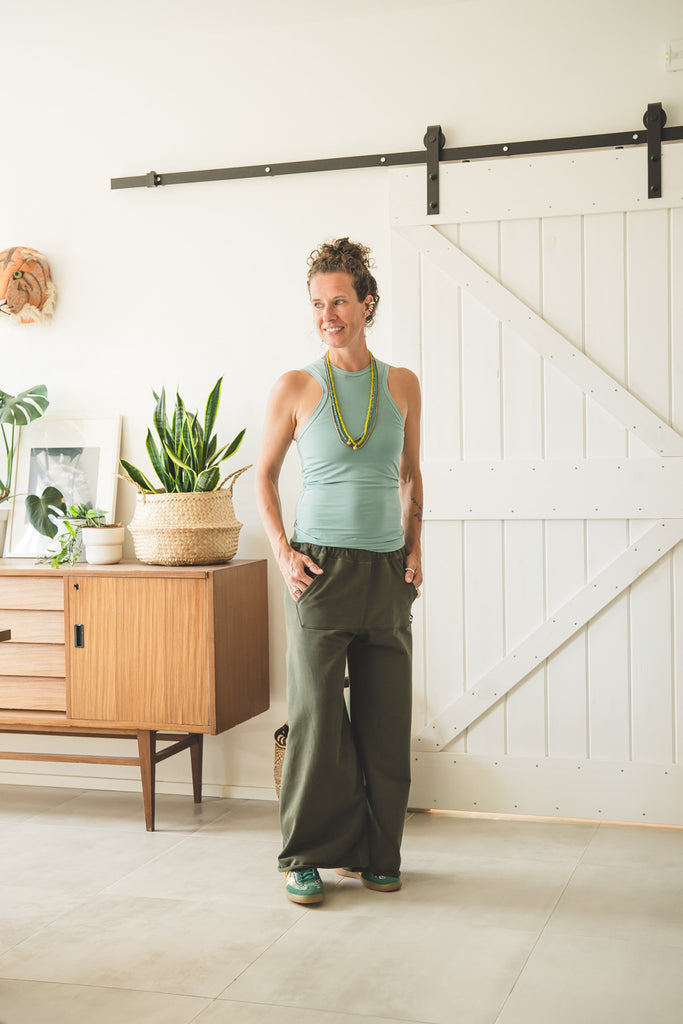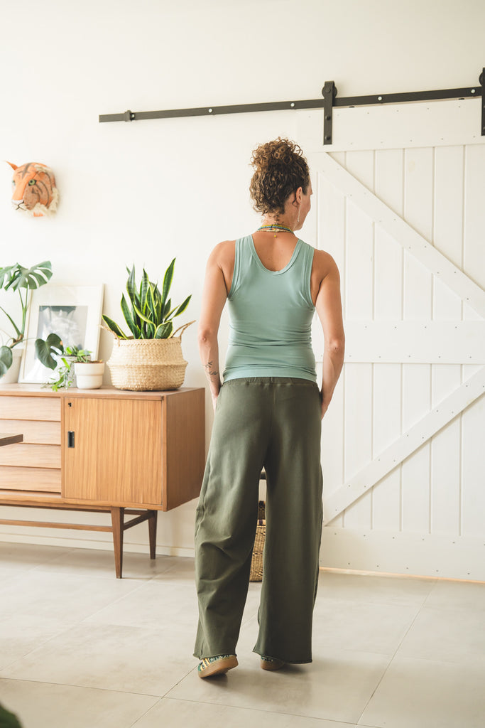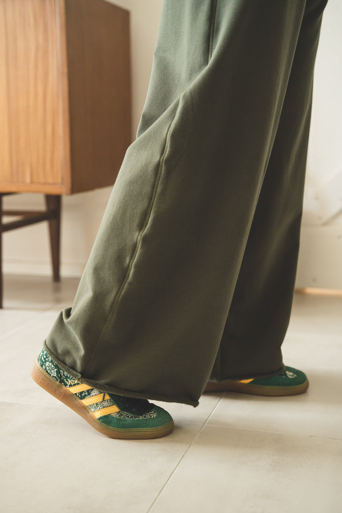 FlaredPants hanno l'elastico in vita, cadono leggermente a zampa e vestendo abbastanza aderente in vita e sul sedere. La gamba è disegnata per cadere larga e dritta. In fondo sono tagliati a vivo e quindi si arrotolano leggermente. Sul davanti hai una tascha passante, che rende il pantalone particolare e sportivo. Questo modello ha la gamba lunga, arriva a coprire le scarpe.