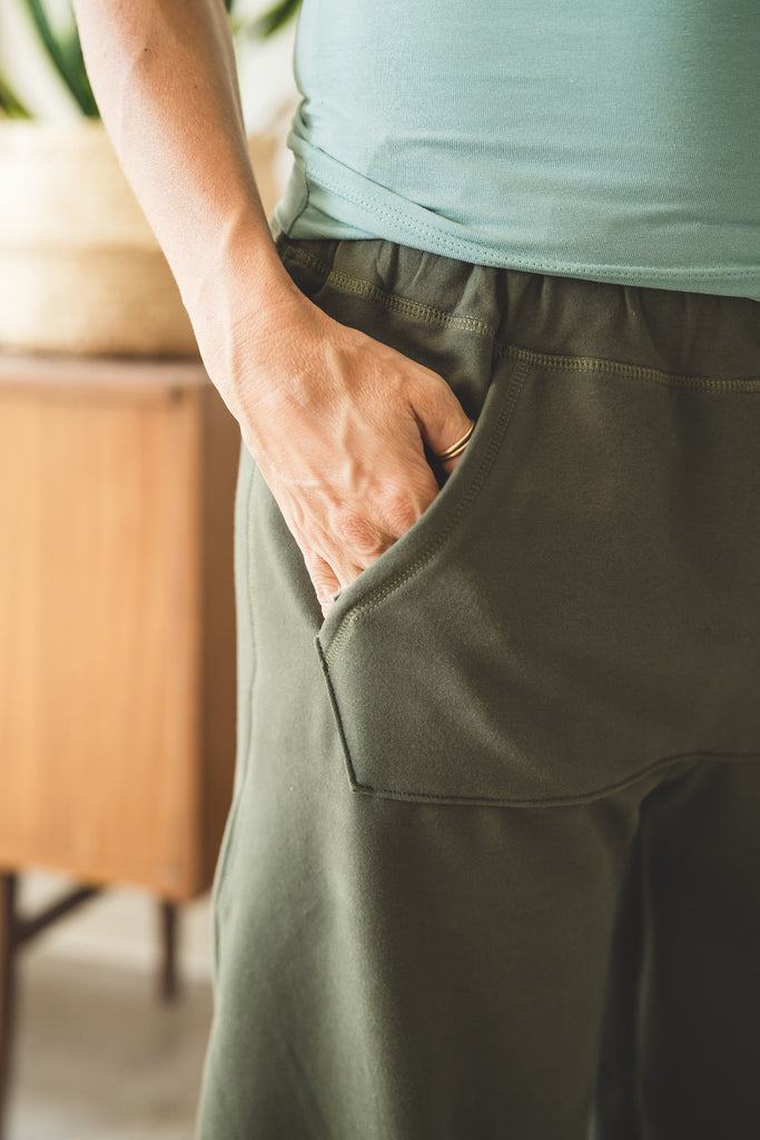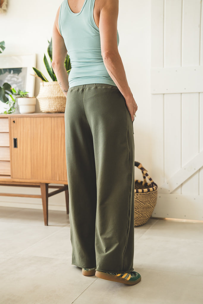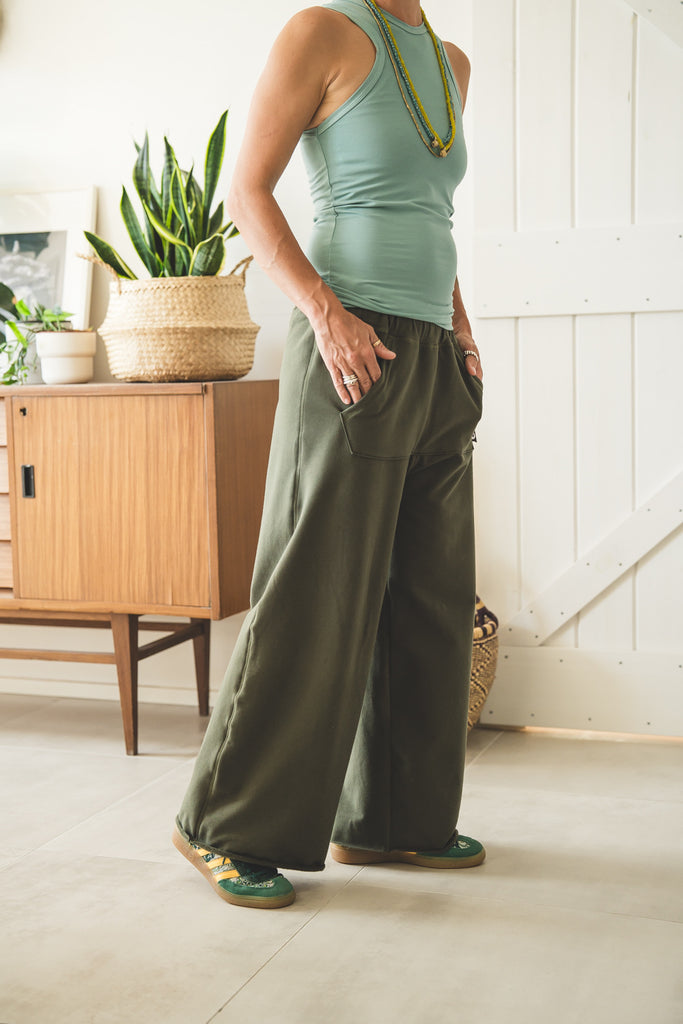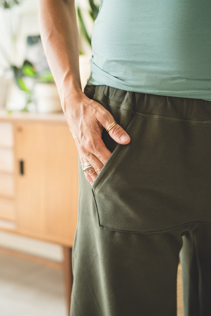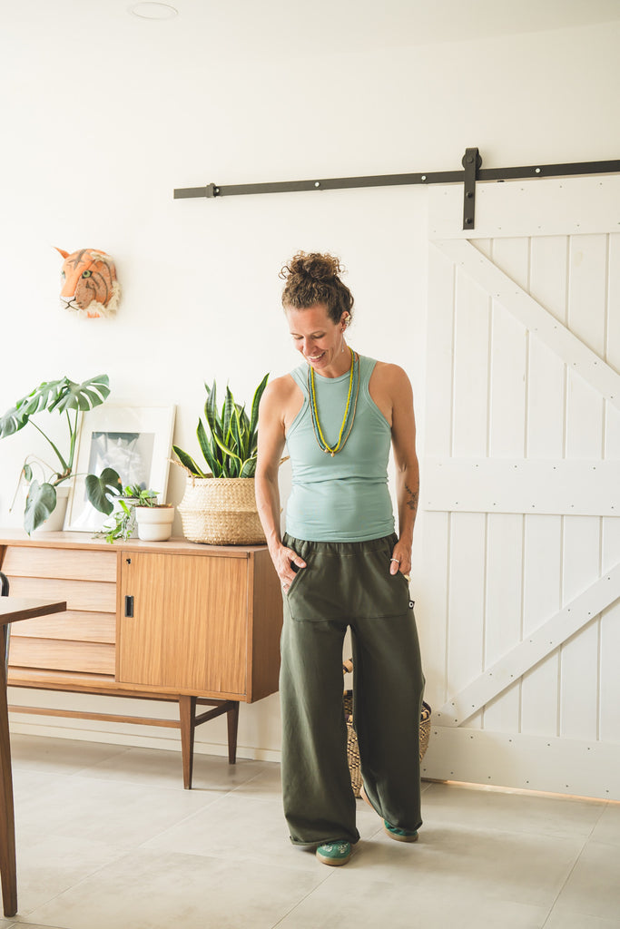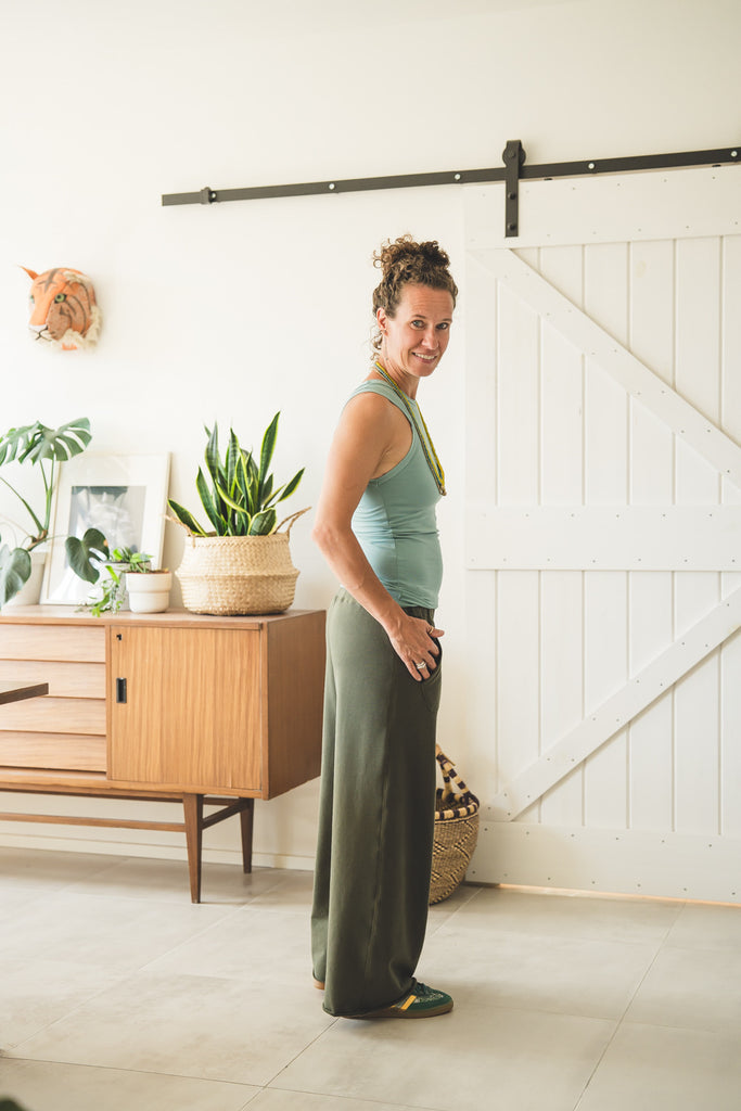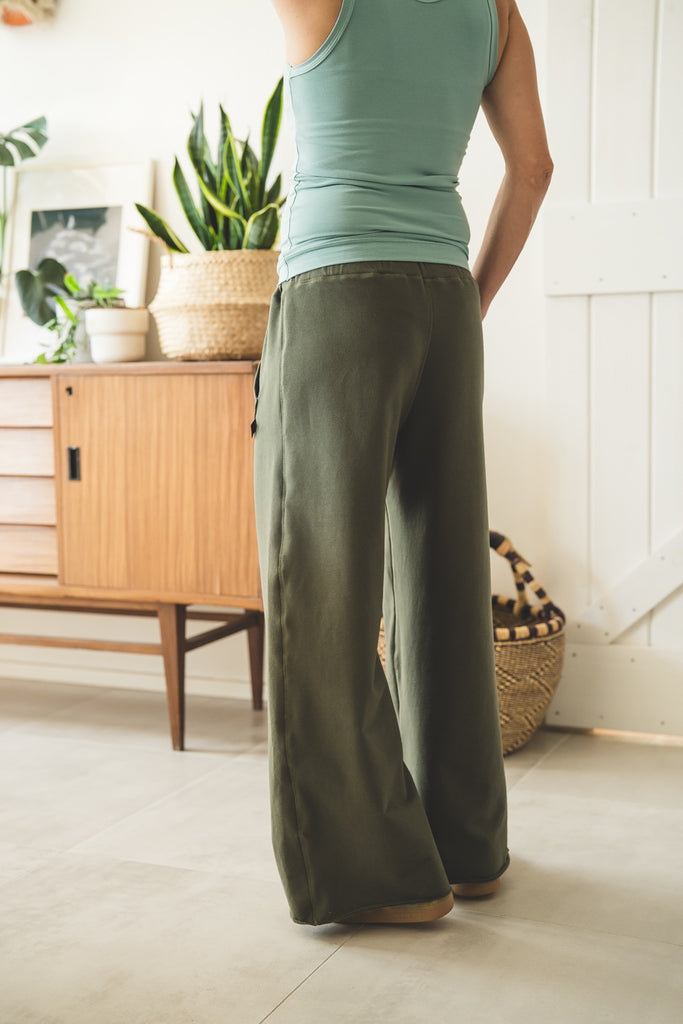 FlaredPants hanno l'elastico in vita, cadono leggermente a zampa e vestendo abbastanza aderente in vita e sul sedere. La gamba è disegnata per cadere larga e dritta. In fondo sono tagliati a vivo e quindi si arrotolano leggermente. Sul davanti hai una tascha passante, che rende il pantalone particolare e sportivo. Questo modello ha la gamba lunga, arriva a coprire le scarpe.