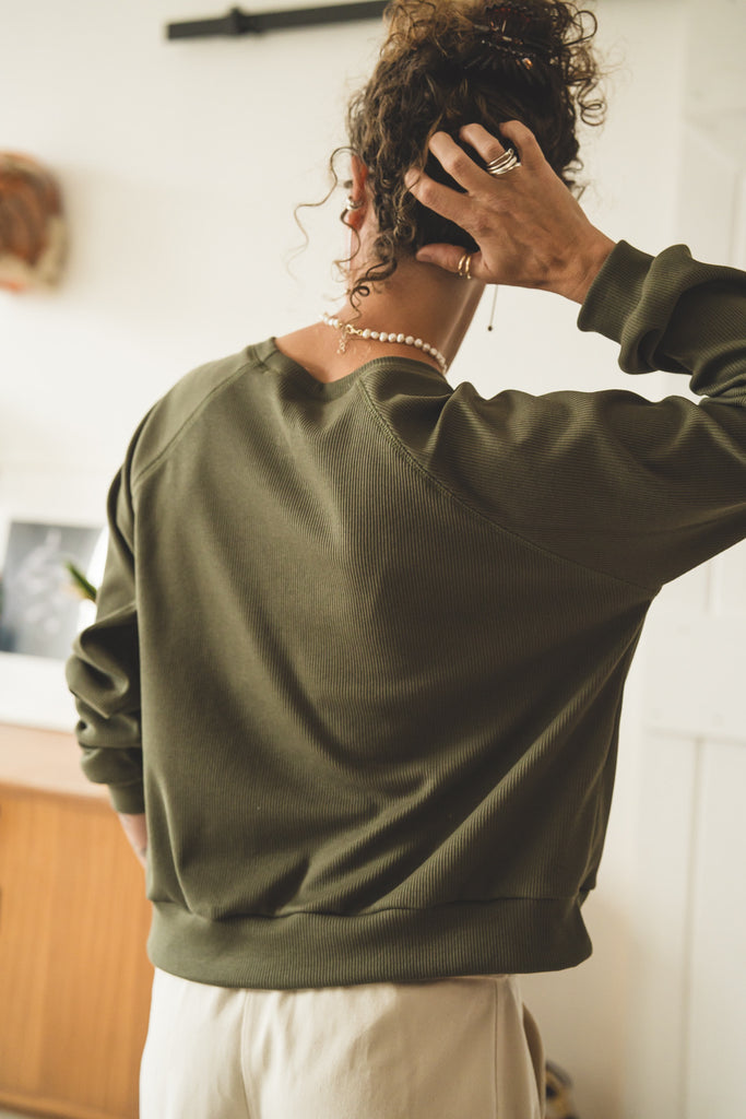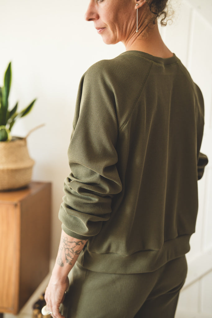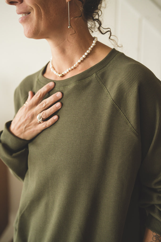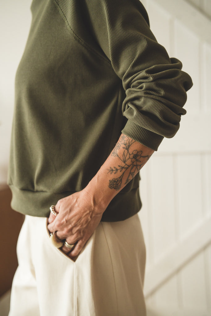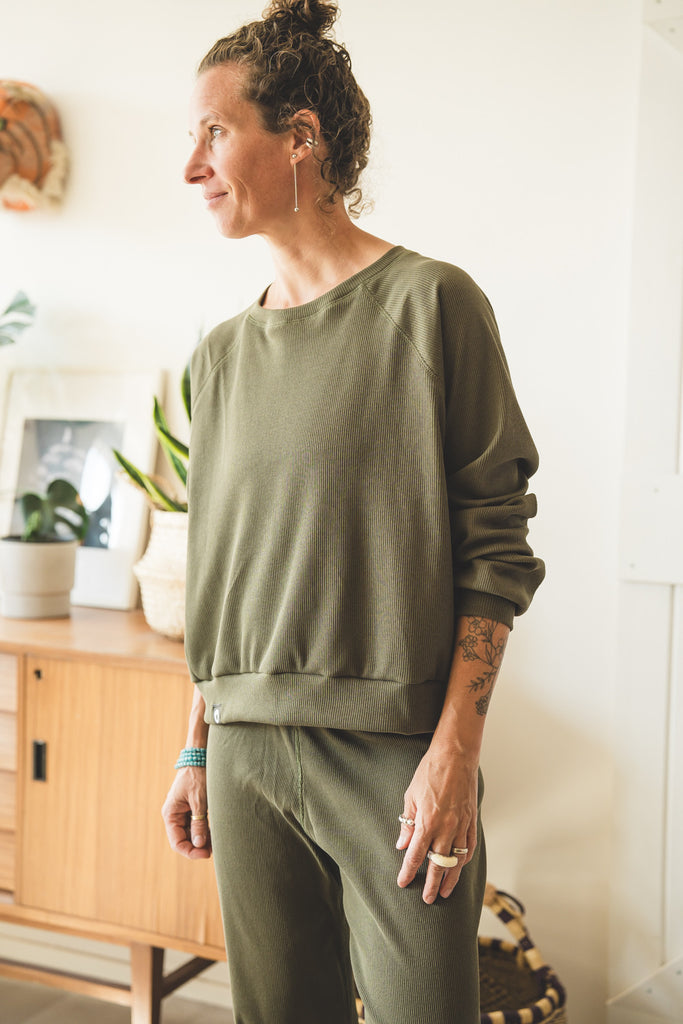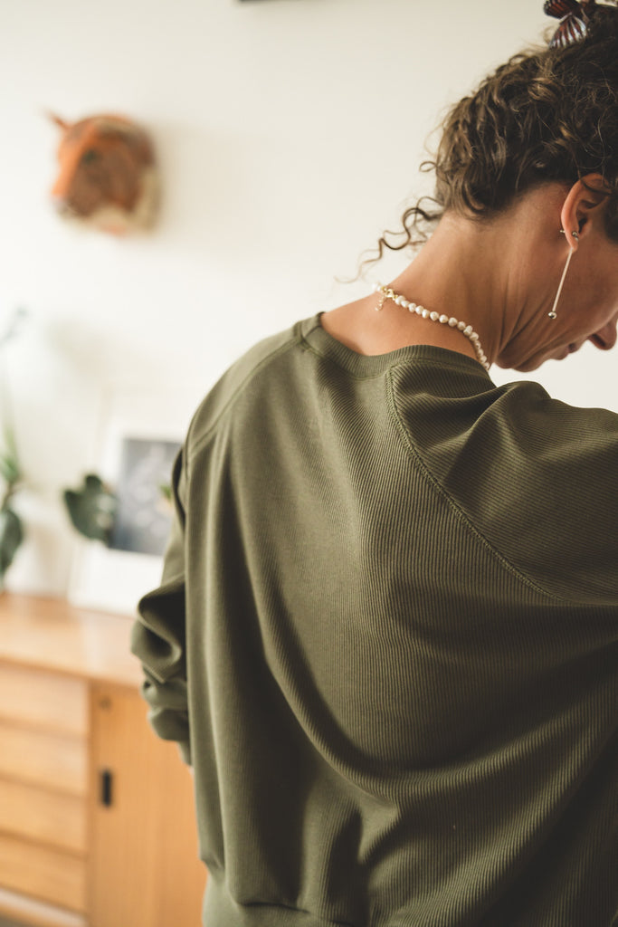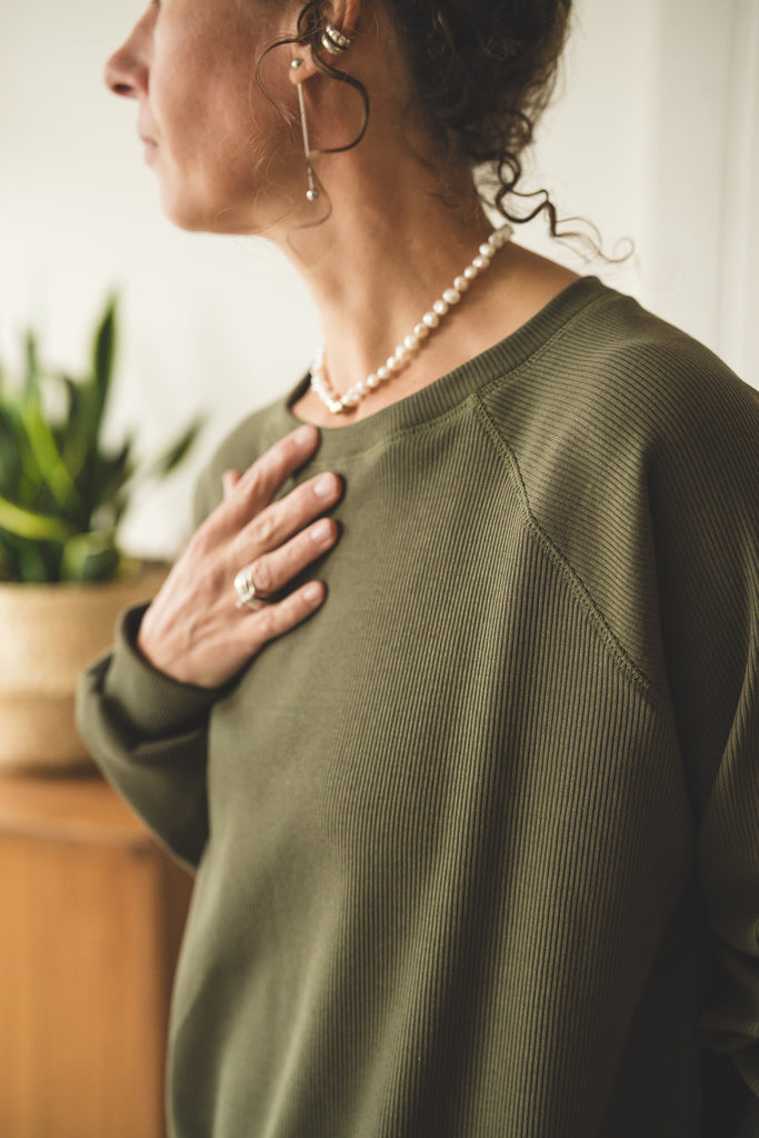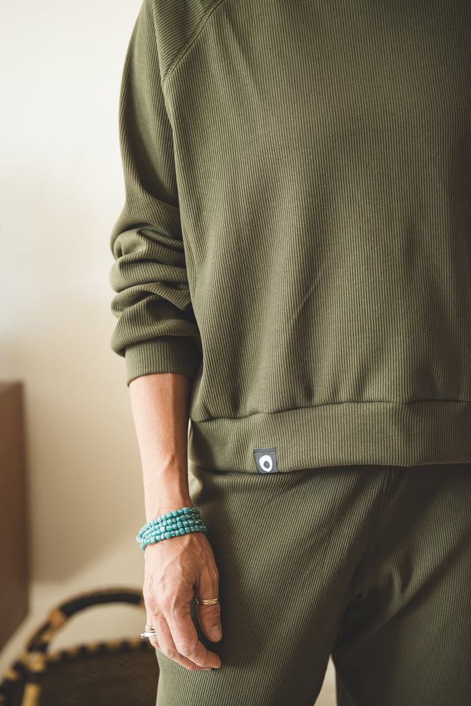 La Ribbed Sweat è perfetta da abbinare ai pantaloni Chakrini e ai RelaxedPants. Comfort totale. La vestibiltà è ampia, modello raglan.