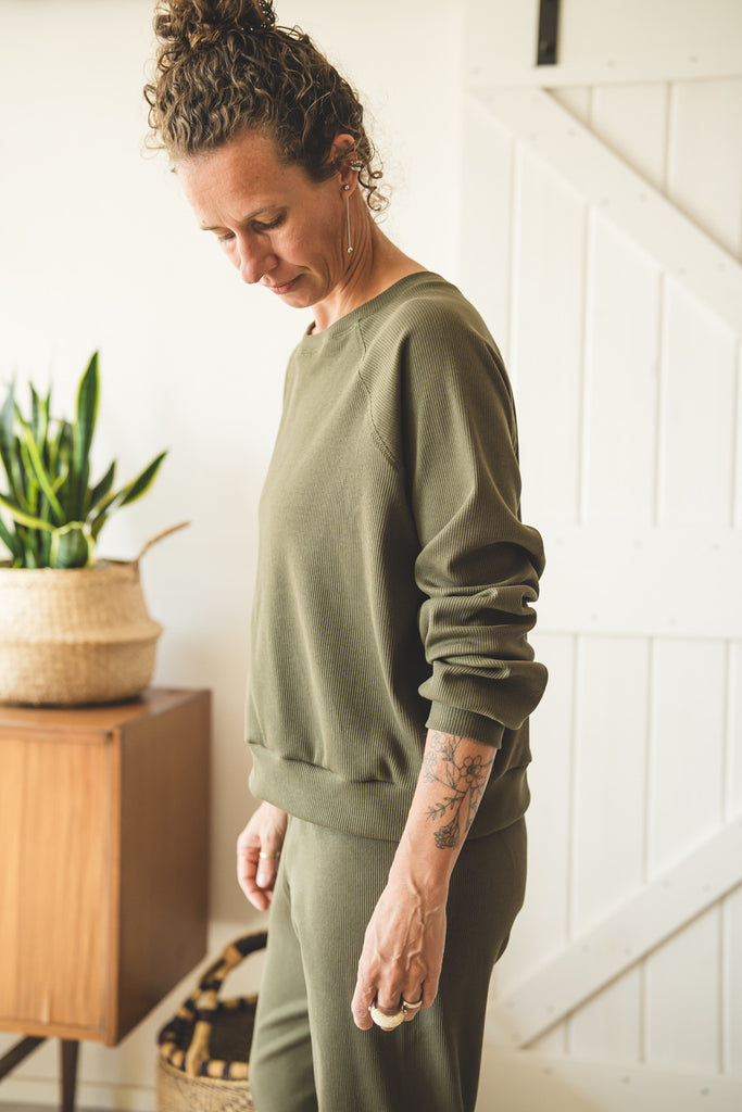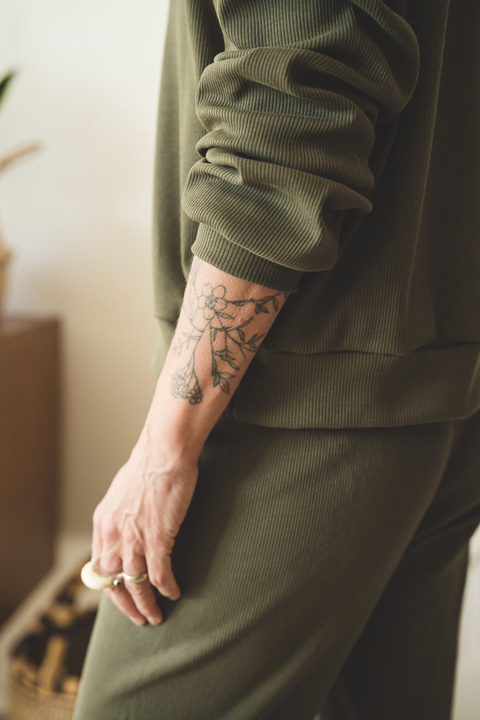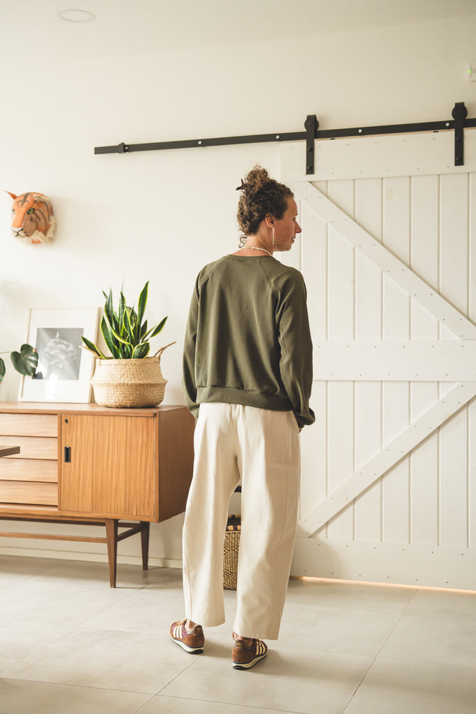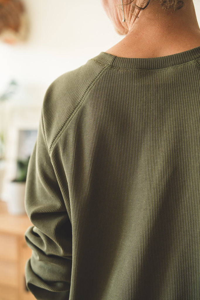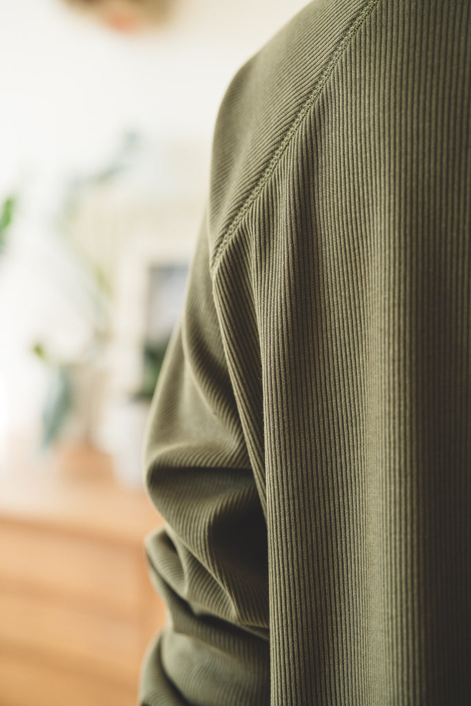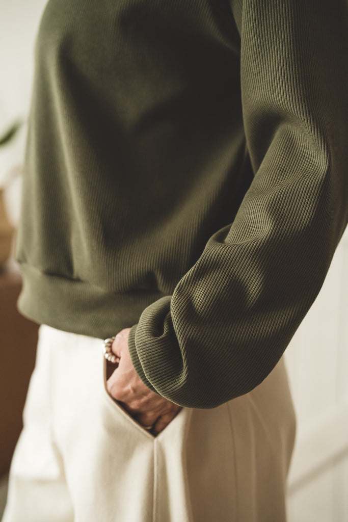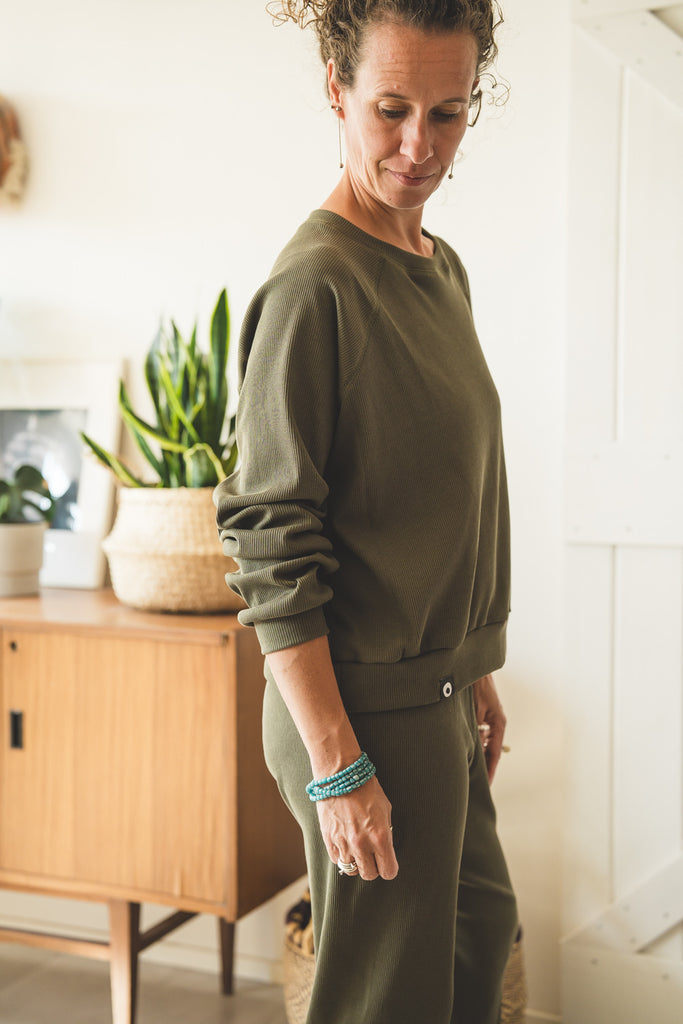 La Ribbed Sweat è perfetta da abbinare ai pantaloni Chakrini e ai RelaxedPants. Comfort totale. La vestibiltà è ampia, modello raglan.