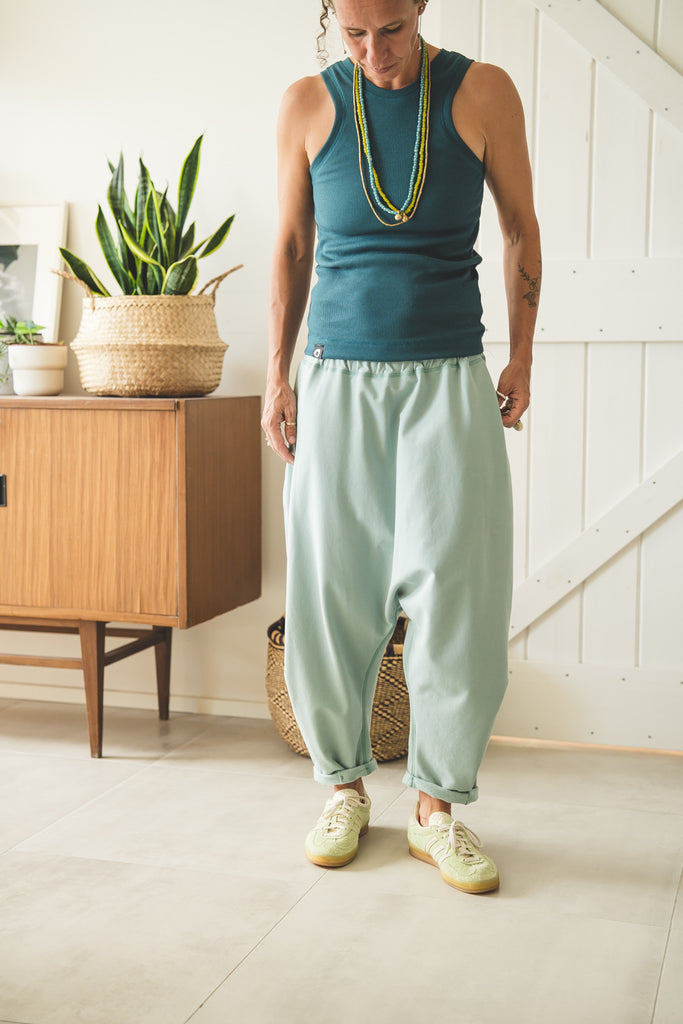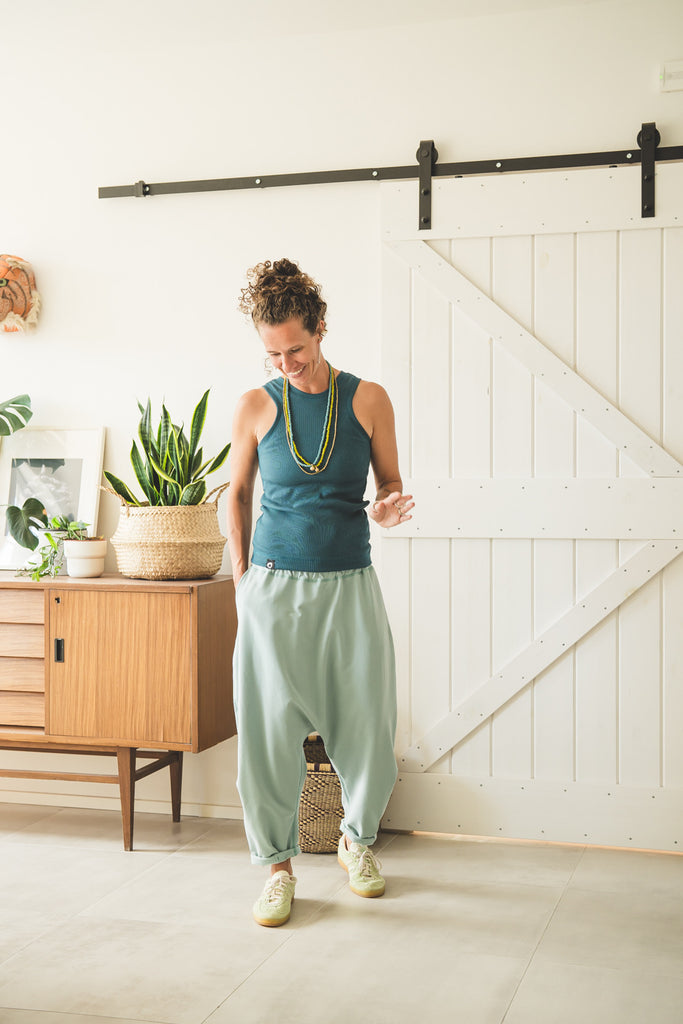 E’ un modello semplice, comodo e arioso. ”Ho disegnato questo modello nel 2020 da cucire insieme alle mie corsiste alla fiera Abilmente. Un modello semplice che regala il massimo del comfort. Negli anni gli abbiamo aggiunto le tasche laterali, le cuciture rinforzati per una forte resistenza all’usura e per accompagnarvi ancora meglio nei vostri movimenti. Il KoiPants è caratterizzato dalla piega sul ginocchio che viene ripreso nel risvolto in fondo. Un gioco calibrato che da personalità a questo pantalone.