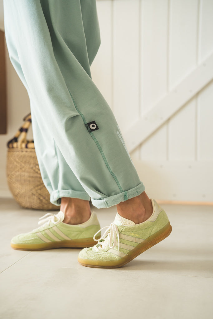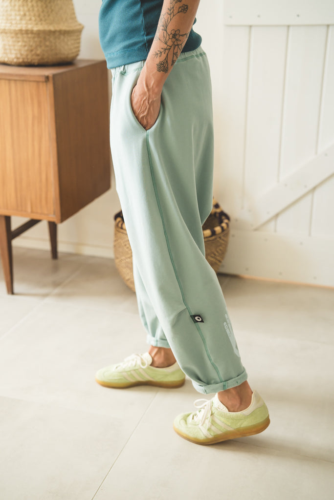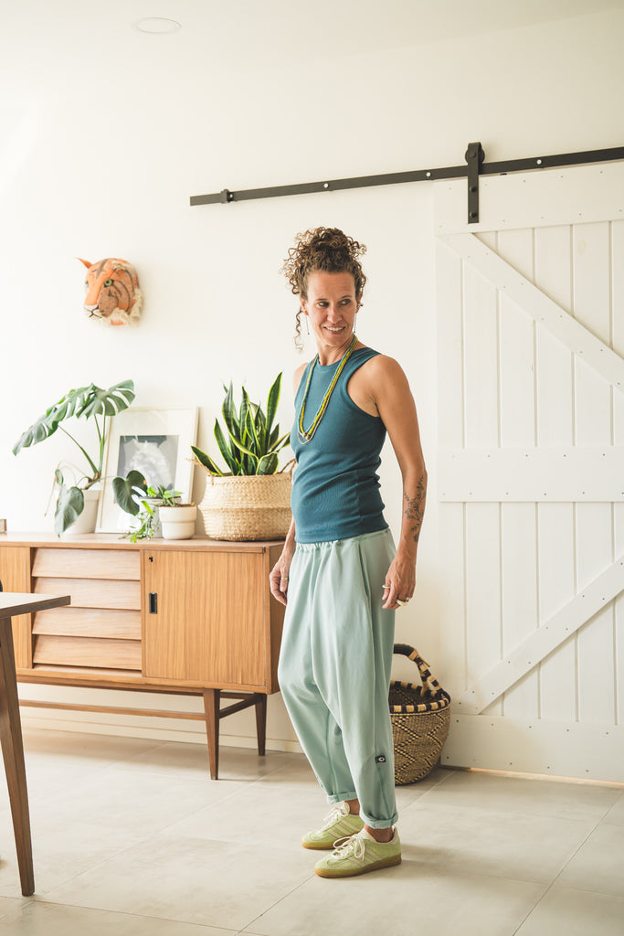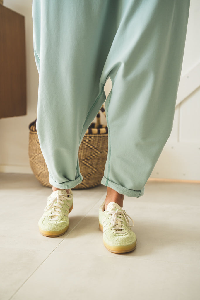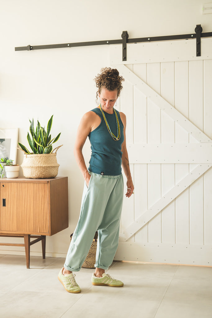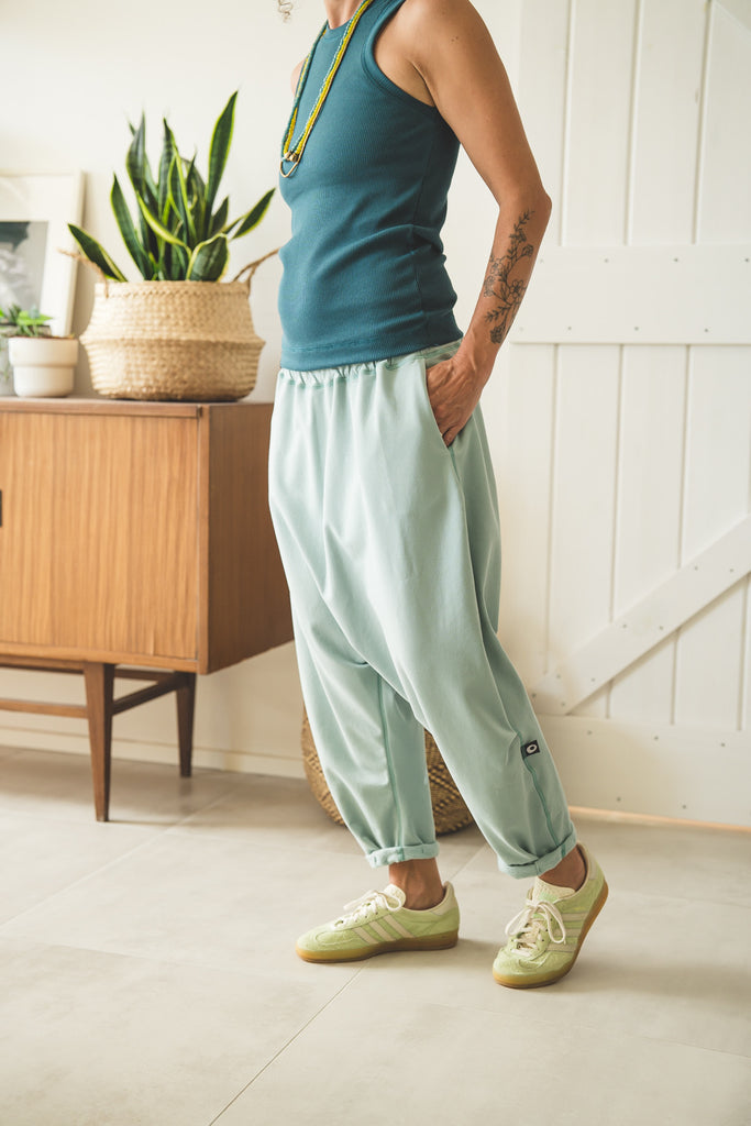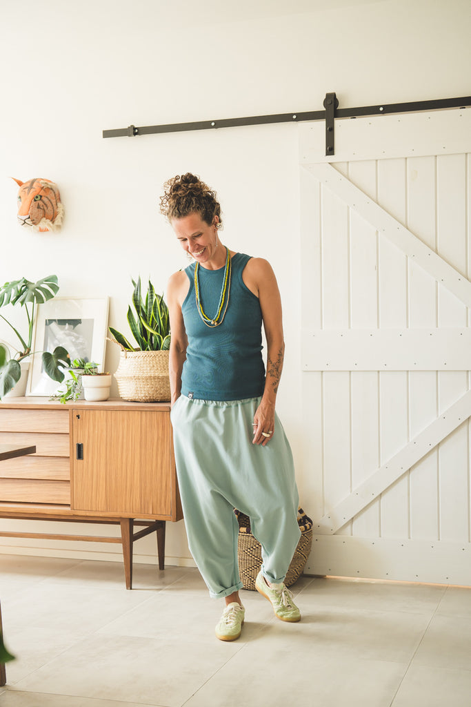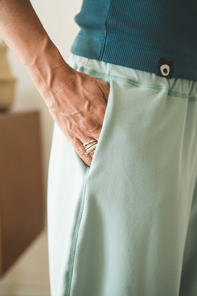 Il KoiPants cade morbido sui fianchi, ha il cavallo basso, l’elastico in vita e due tasche nascoste laterali.