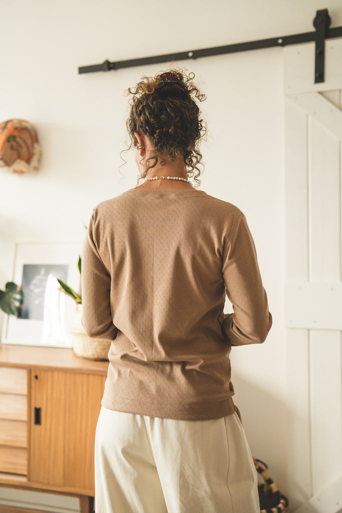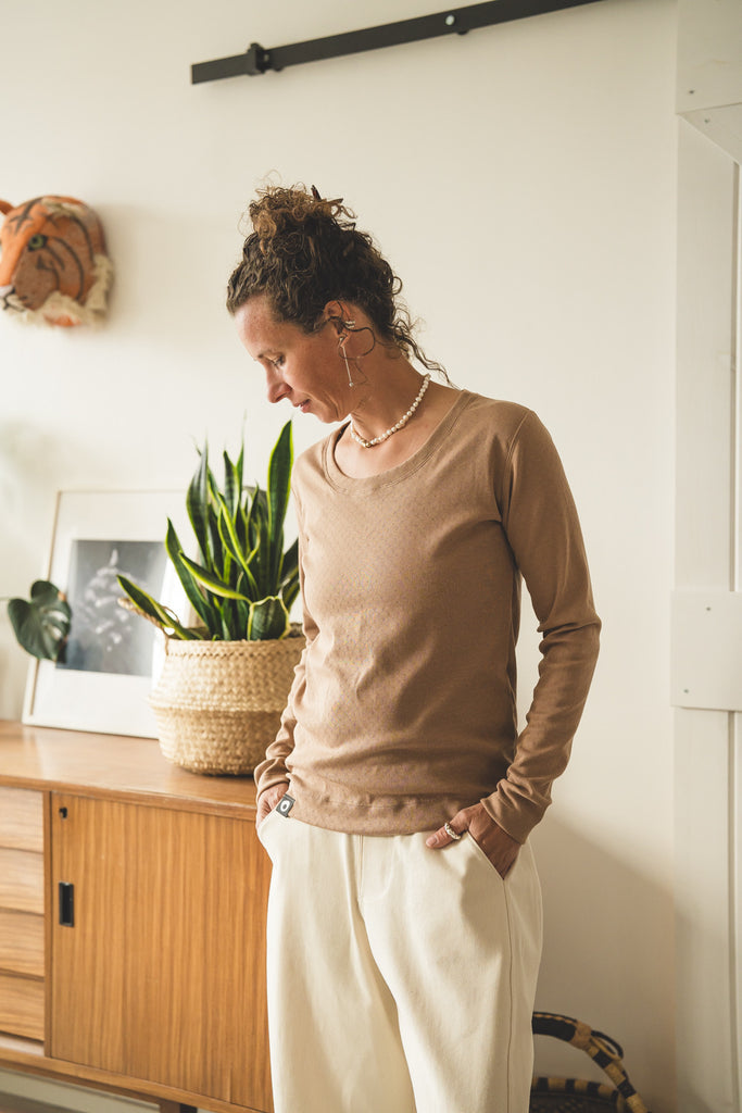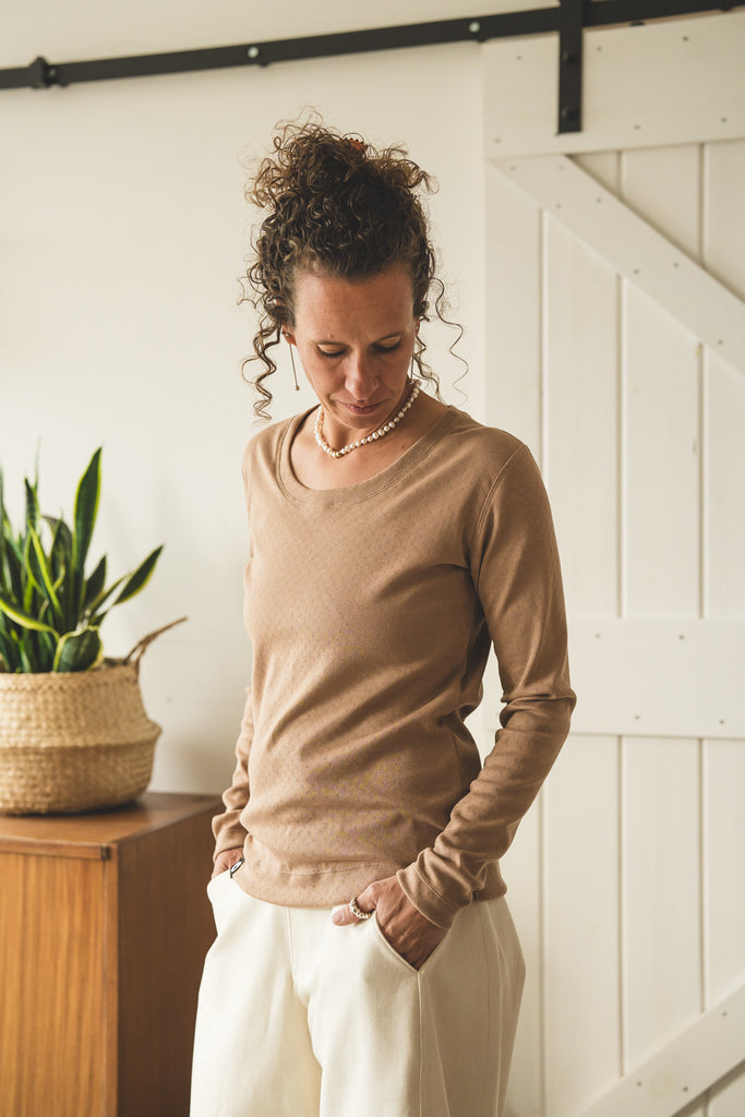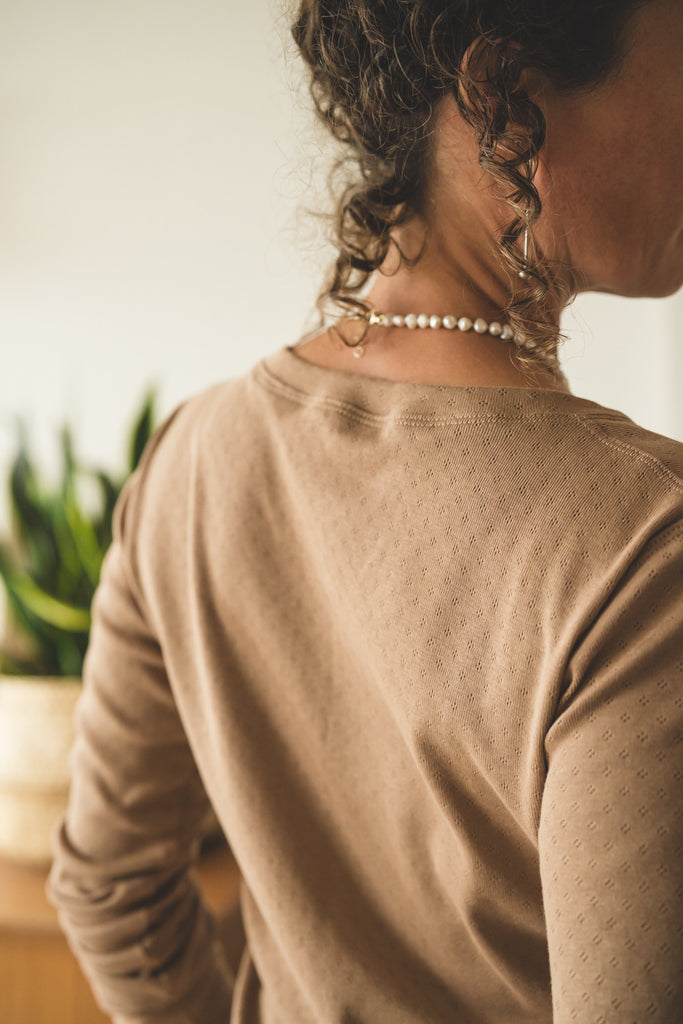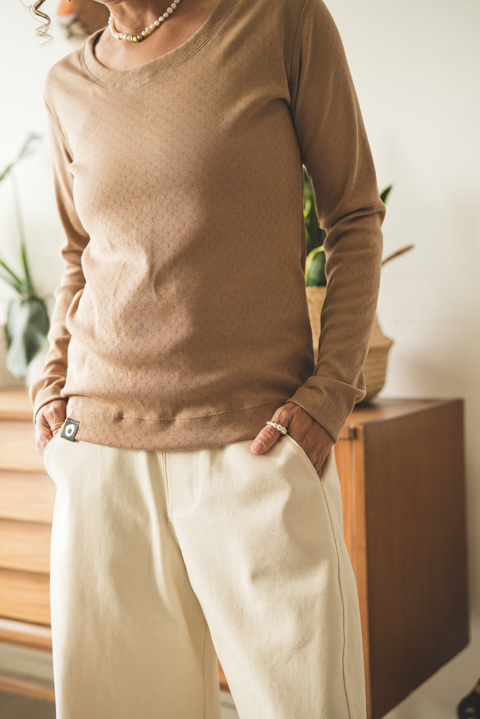 tShirt a maniche lunghe in tessuto pointoille. Modello semplice, che poi usare sia nelle mezze stagioni che in inverno sotto un maglioncino. Vestibilità comoda, scollo medio. Lei è leggermente più lunga e stretta del modello BOXY.