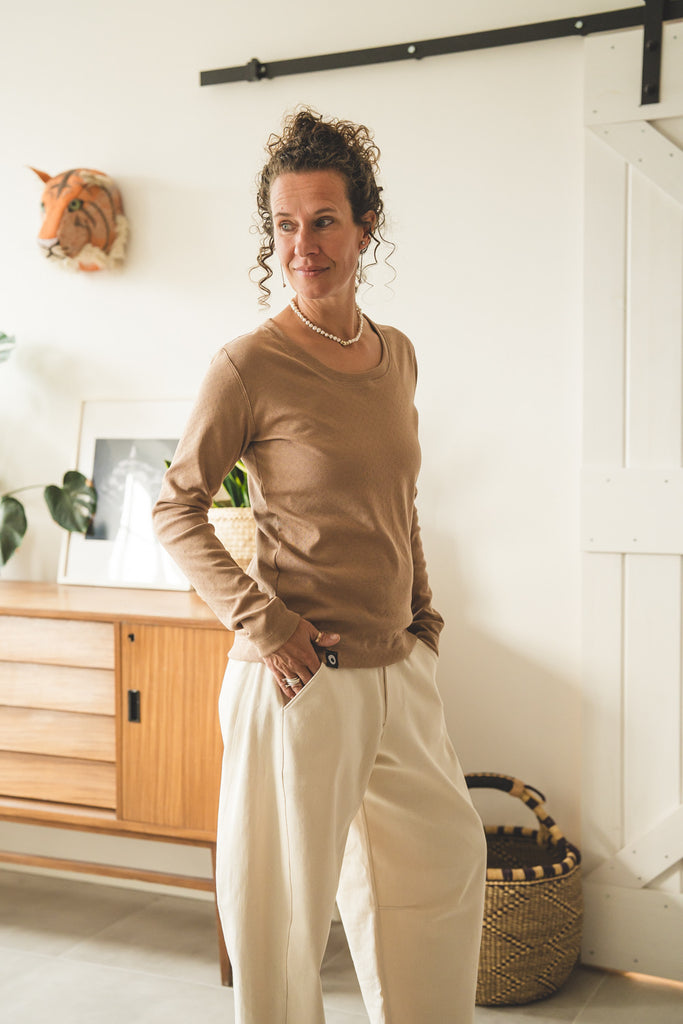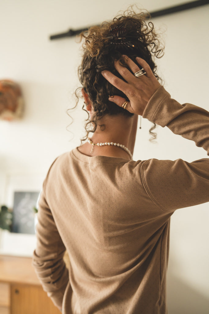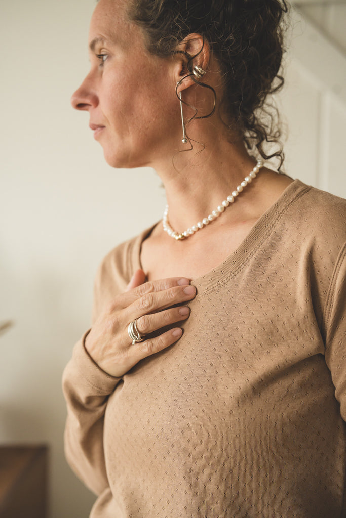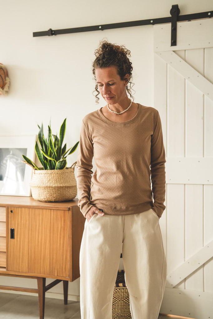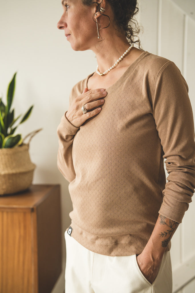 tShirt a maniche lunghe in tessuto pointoille. Modello semplice, che poi usare sia nelle mezze stagioni che in inverno sotto un maglioncino. Vestibilità comoda, scollo medio. Lei è leggermente più lunga e stretta del modello BOXY.