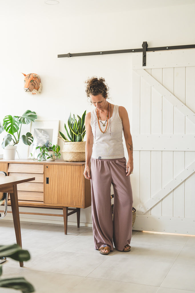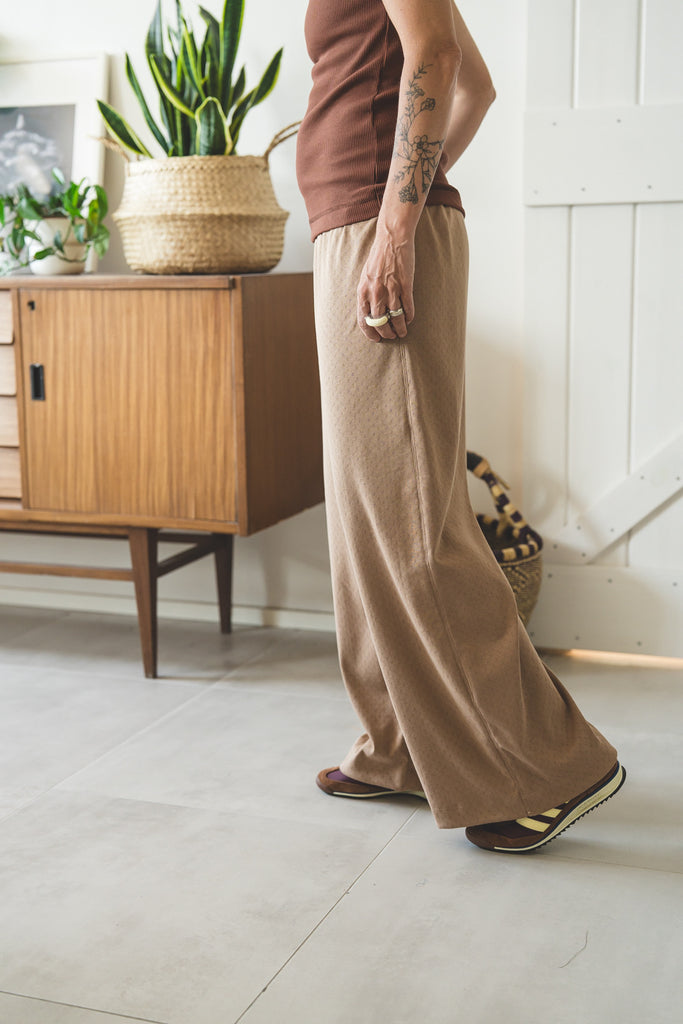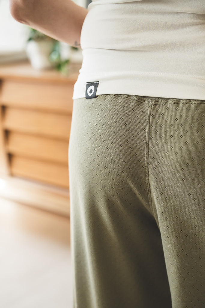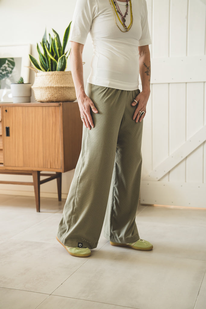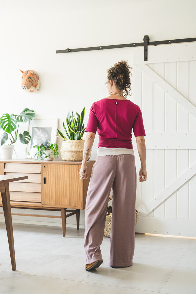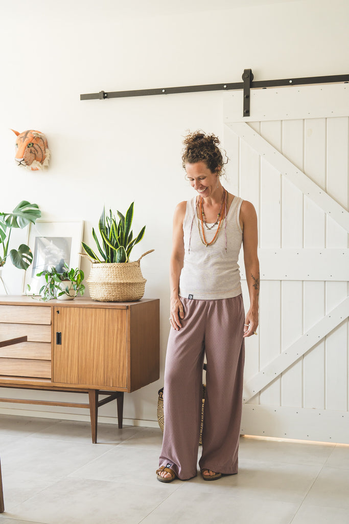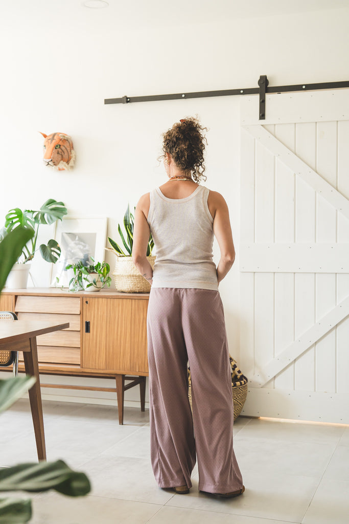 Il nostro modello RelaxedPants in tessuto Pointoille - jersey leggero e super morbido oltre ad essere 100% cotone. Pantalone a palazzo come vanno moltissimo proprio adesso. Il modello cade fluido e un pò svolazzante, ha la gamba extra lunga (per creare quell'effetto della gamba iiiinfinita) e può essere indossato anche a vita alta.
