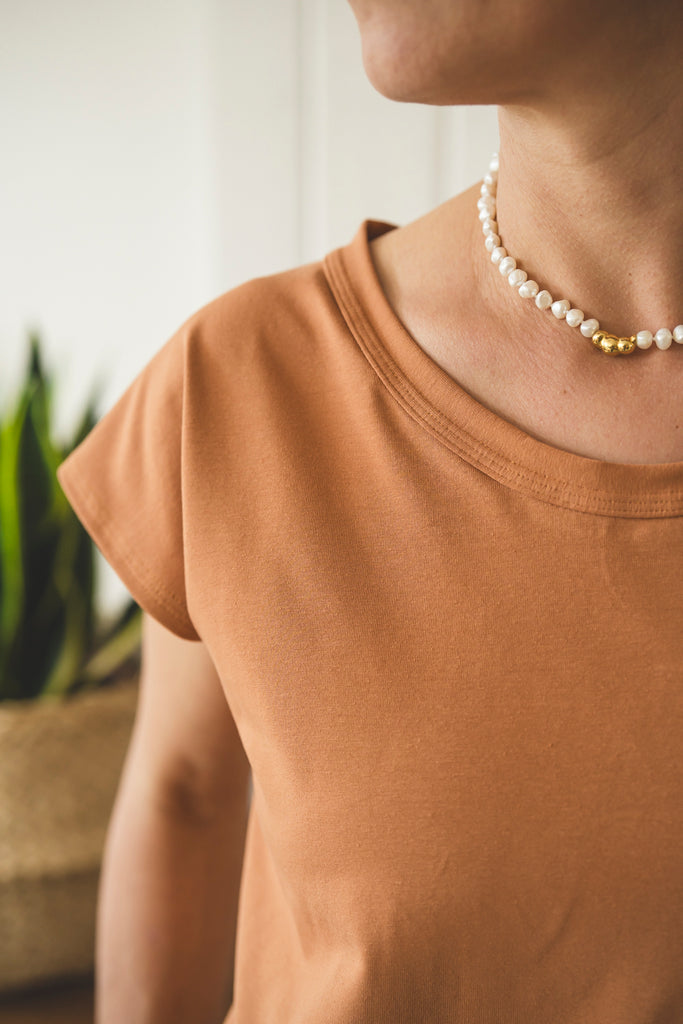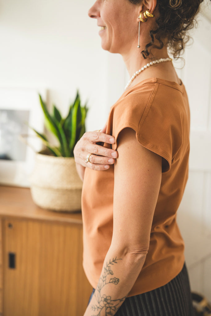 Il tessuto è jersey composto da 95% cottone e 5% elastane, certificato OekoTex Standard 100.