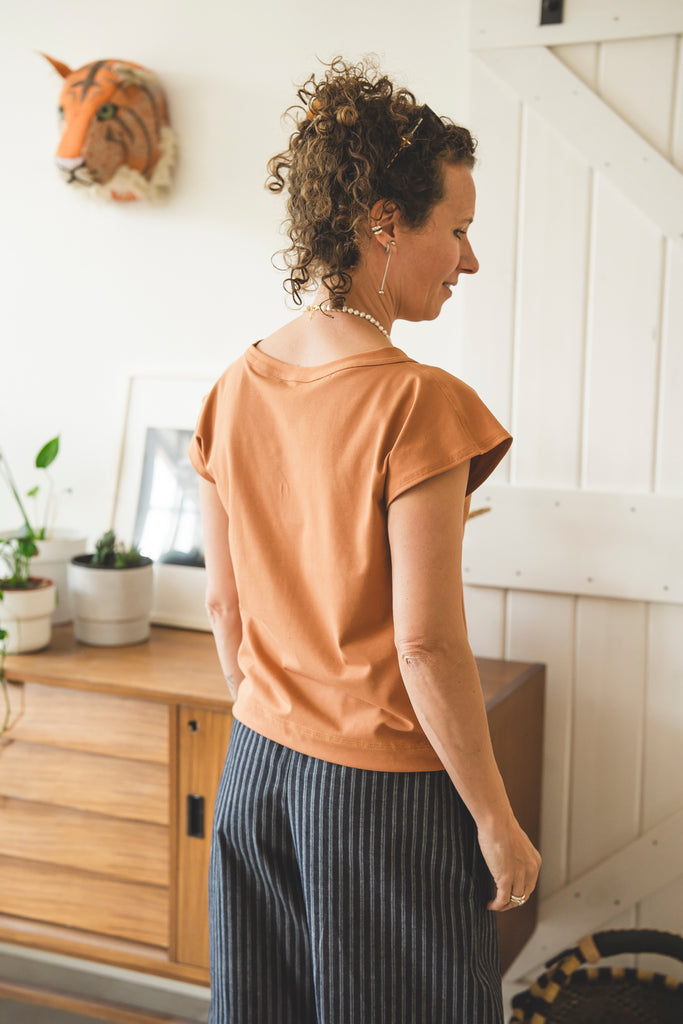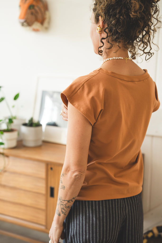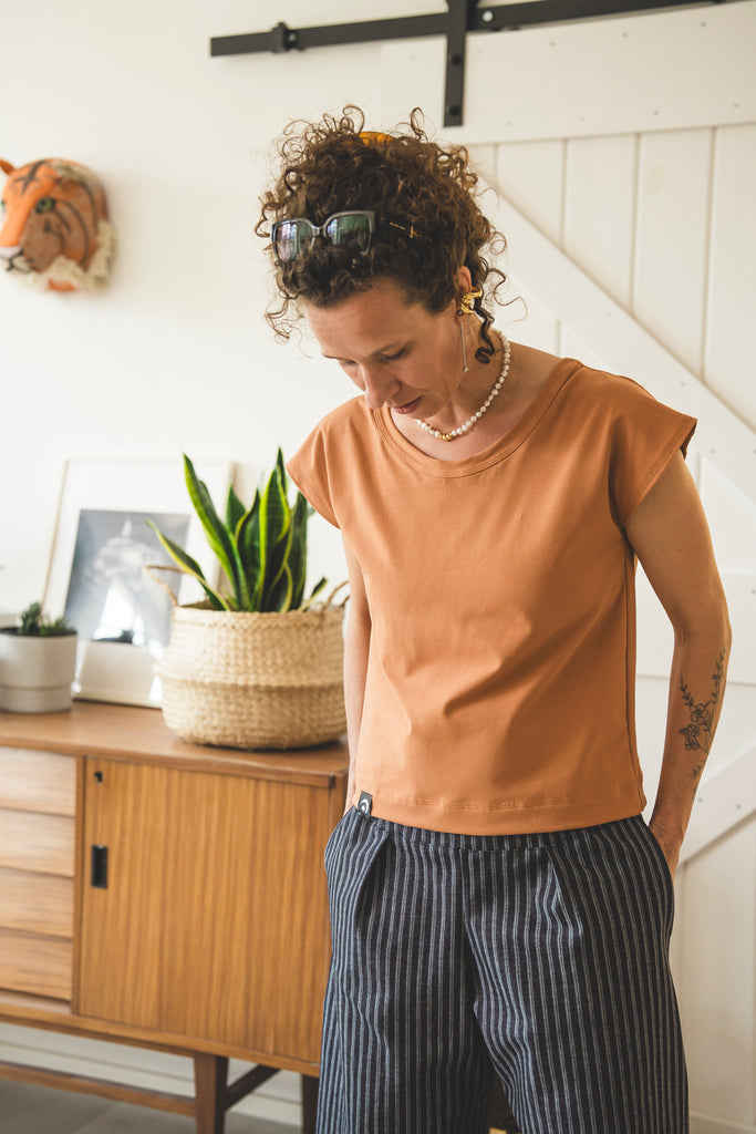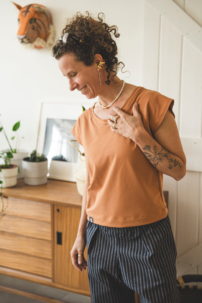Il modello Sleeveless Tee sta tra la canotta e la tShirt. Modello a T senza manica e con collo ampio. Vestibilita leggermente più corta della Classic tShirt. Modello non adrente, ma nemmeno over. Vestibilità regolare. La Sleeveless Tee viene interamente rifinitacon la macchina da copertura che rende questo modello un super essential.