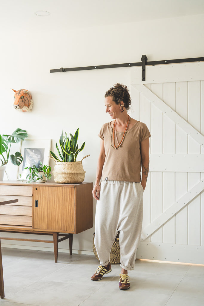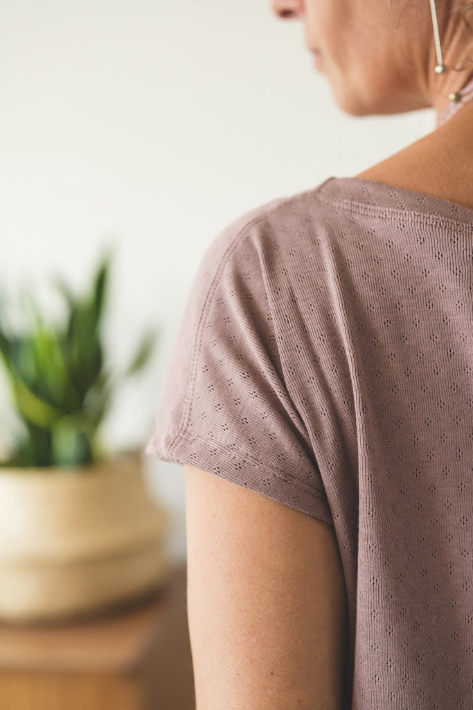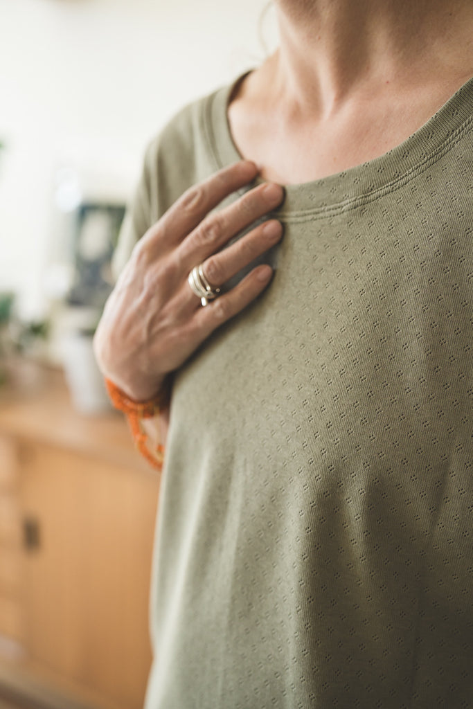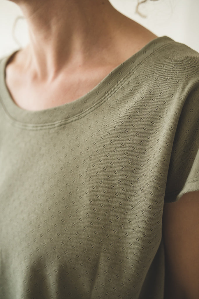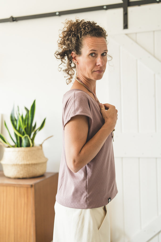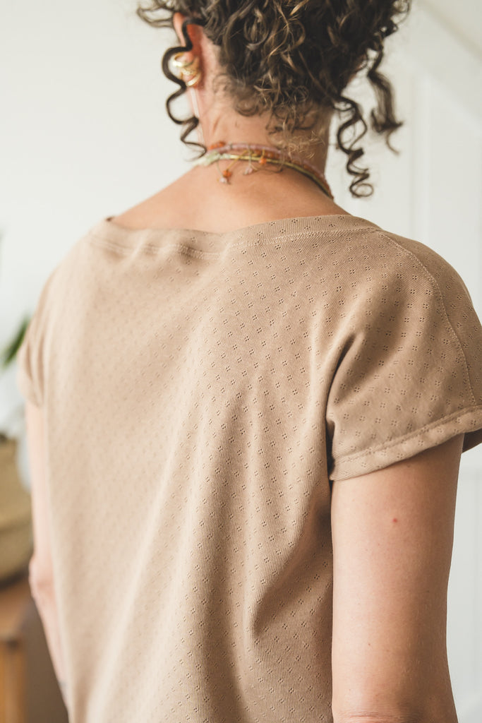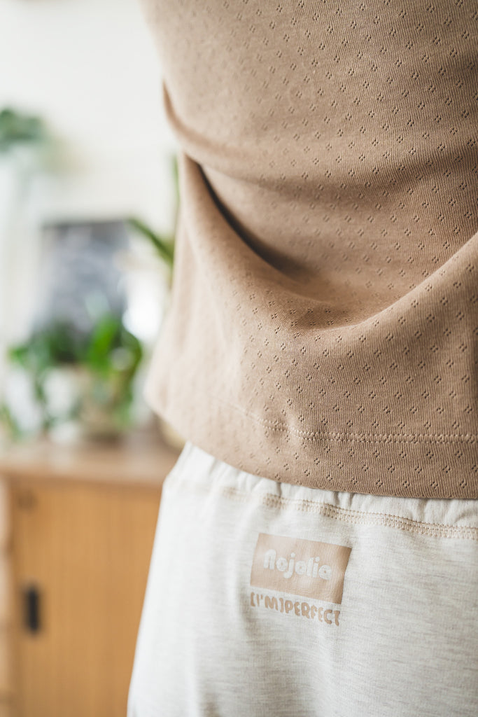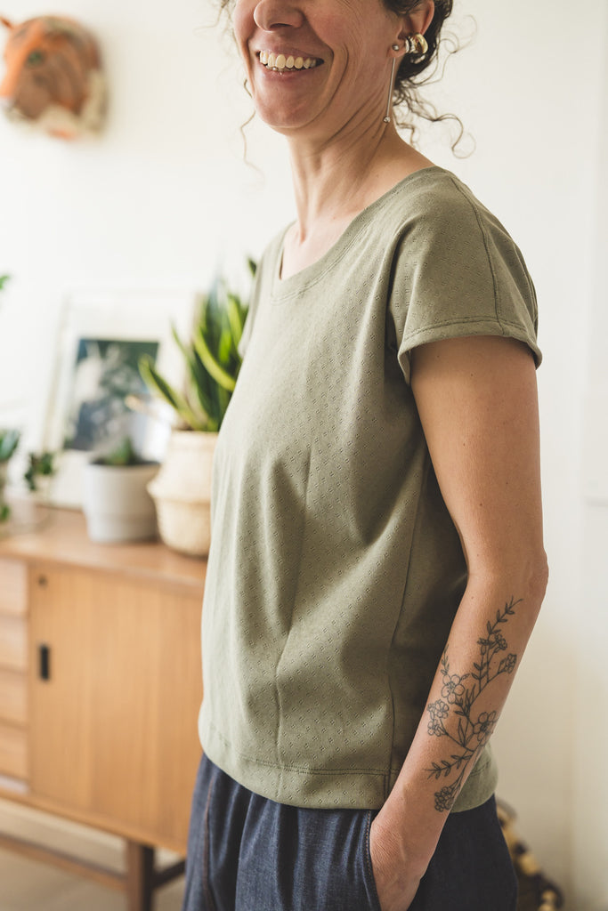 Il tessuto è jersey composto da 95% cottone e 5% elastane, certificato OekoTex Standard 100.